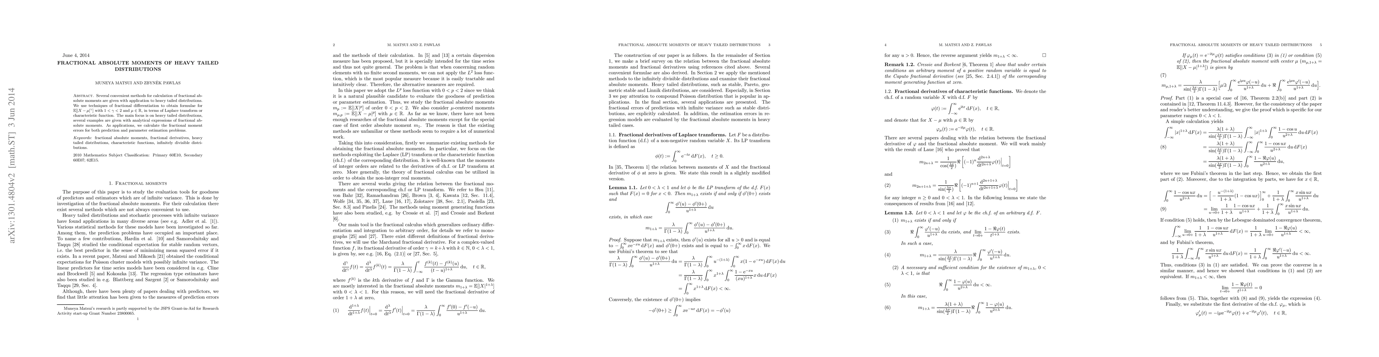 This paper presents methods for calculating fractional absolute moments for heavy-tailed distributions using fractional differentiation techniques. It provides analytical expressions for $E[|X-\mu|^\gamma]$ with $1<\gamma<2$ and applies these to analyze prediction and parameter estimation errors.