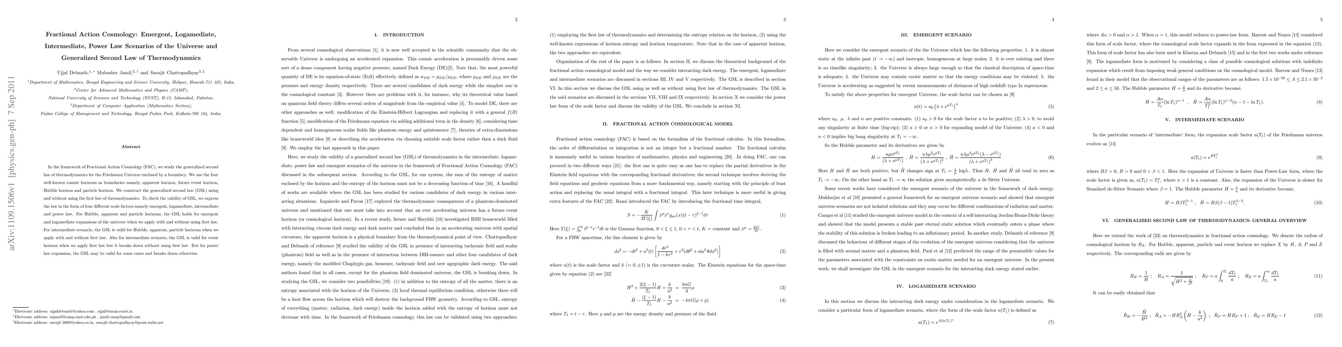 This paper investigates the generalized second law of thermodynamics in Fractional Action Cosmology using various cosmic horizons. The study finds that the generalized second law holds for emergent and logamediate universe expansions across different horizons, while its validity varies in intermediate and power law scenarios, depending on whether the first law of thermodynamics is applied.