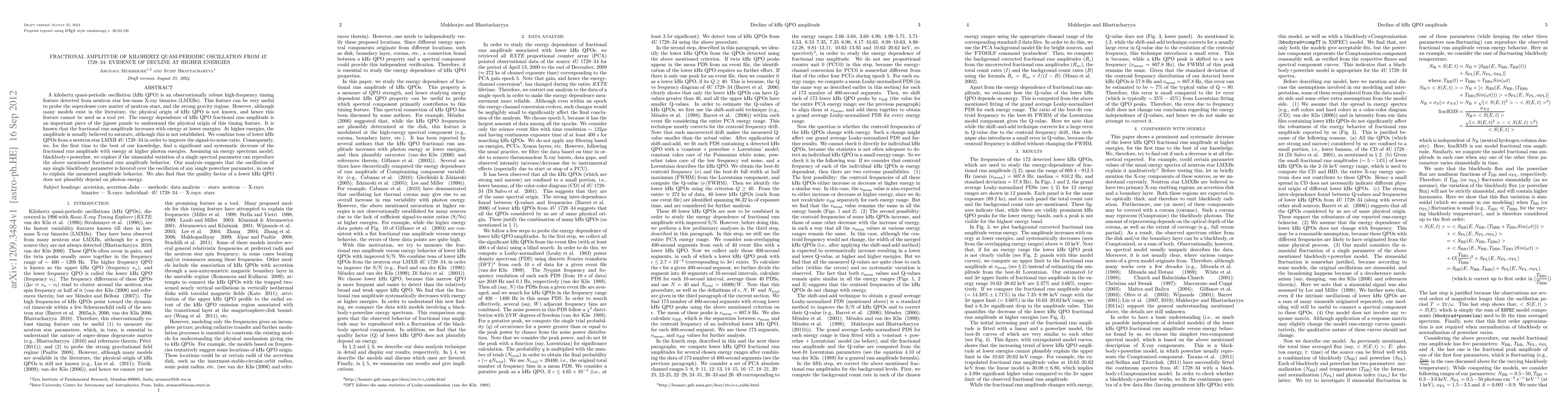 A kilohertz quasi-periodic oscillation (kHz QPO) is an observationally robust high-frequency timing feature detected from neutron star low-mass X-ray binaries (LMXBs). This feature can be very useful to probe the superdense core matter of neutron stars, and the strong gravity regime. However, although many models exist in the literature, the physical origin of kHz QPO is not known, and hence this feature cannot be used as a tool yet. The energy dependence of kHz QPO fractional rms amplitude is an important piece of the jigsaw puzzle to understand the physical origin of this timing feature. It is known that the fractional rms amplitude increases with energy at lower energies. At higher energies, the amplitude is usually believed to saturate, although this is not established. We combine tens of lower kHz QPOs from a neutron star LMXB 4U 1728-34 in order to improve the signal-to-noise-ratio. Consequently, we, for the first time to the best of our knowledge, find a significant and systematic decrease of the fractional rms amplitude with energy at higher photon energies. Assuming an energy spectrum model, blackbody+powerlaw, we explore if the sinusoidal variation of a single spectral parameter can reproduce the above mentioned fractional rms amplitude behavior. Our analysis suggests that the oscillation of any single blackbody parameter is favored over the oscillation of any single powerlaw parameter, in order to explain the measured amplitude behavior. We also find that the quality factor of a lower kHz QPO does not plausibly depend on photon energy.