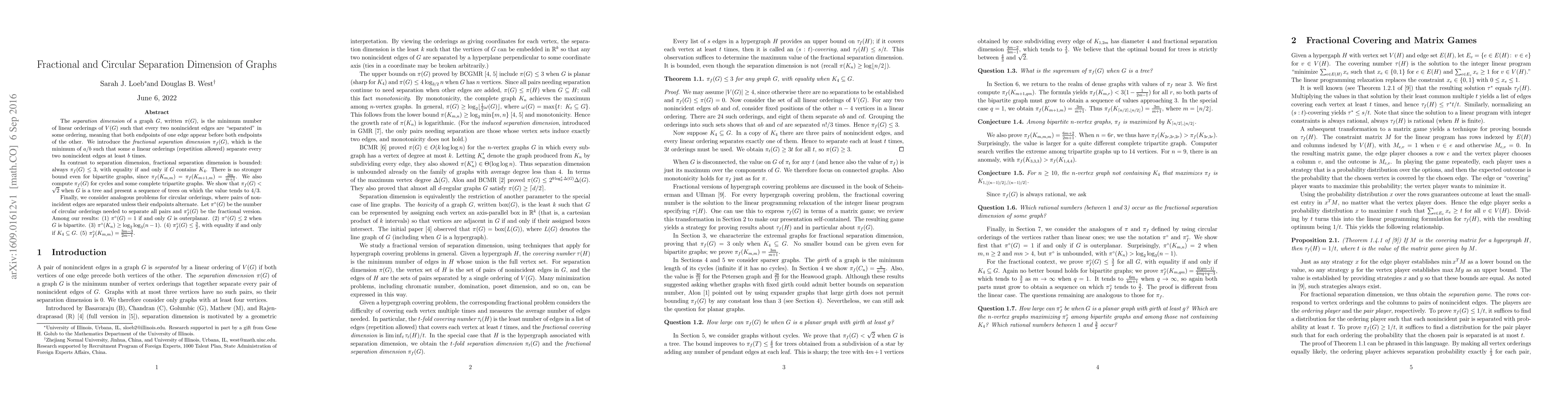 Researchers introduced a new measure of graph separation dimension, called fractional separation dimension, which is bounded at most 3 for all graphs, with equality only in complete quadratics; they also found bounds on circular orderings.