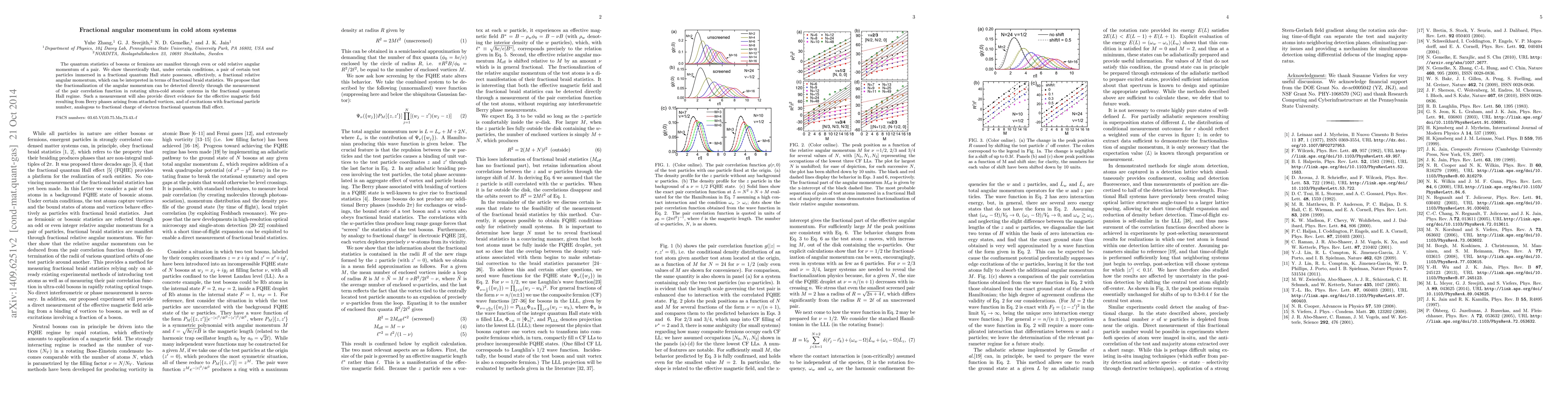 This paper theoretically demonstrates that pairs of particles in a fractional quantum Hall state can exhibit fractional relative angular momentum, interpreted via fractional braid statistics. It proposes that this phenomenon can be detected through measurements of pair correlation functions in rotating ultra-cold atomic systems, providing evidence for effective magnetic fields and excitations with fractional particle number.