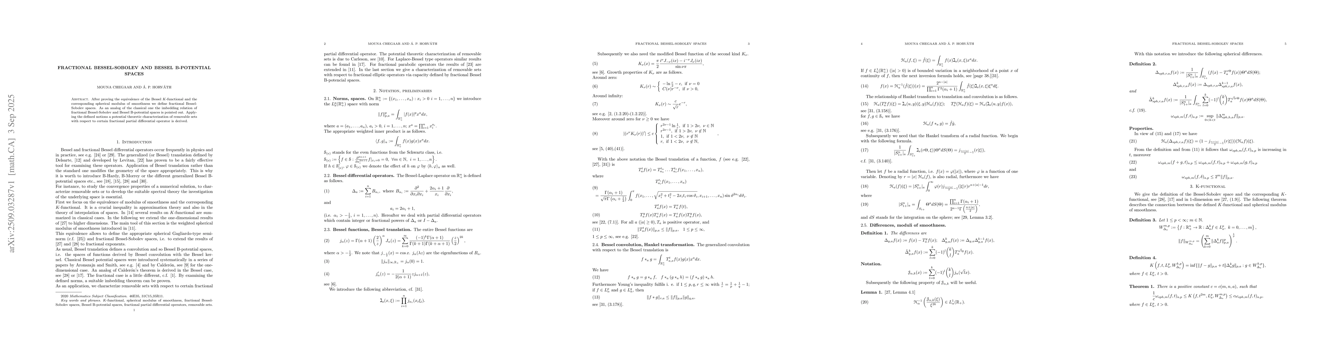 After proving the equivalence of the Bessel $K$-functional and the corresponding spherical modulus of smoothness we define fractional Bessel-Sobolev spaces. As an analog of the classical one the imbedding relation of fractional Bessel-Sobolev and Bessel B-potential spaces is pointed out. Applying the defined notions a potential theoretic characterization of removable sets with respect to certain fractional partial differential operator is derived.