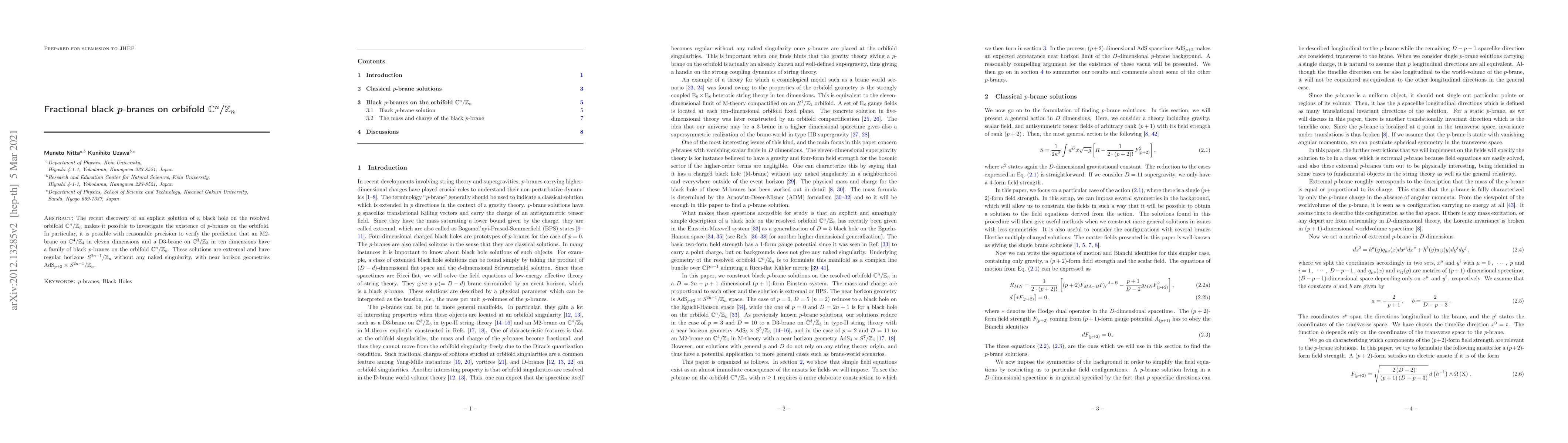 The recent discovery of an explicit solution of a black hole on the resolved orbifold ${\mathbb C}^n/{\mathbb Z}_n$ makes it possible to investigate the existence of $p$-branes on the orbifold. In particular, it is possible with reasonable precision to verify the prediction that an M2-brane on ${\mathbb C}^4/{\mathbb Z}_4$ in eleven dimensions and a D3-brane on ${\mathbb C}^3/{\mathbb Z}_3$ in ten dimensions have a family of black $p$-branes on the orbifold ${\mathbb C}^n/{\mathbb Z}_n$. These solutions are extremal and have regular horizons $S^{2n-1}/{\mathbb Z}_n$ without any naked singularity, with near horizon geometries AdS${}_{p+2}\times S^{2n-1}/{\mathbb Z}_n$.