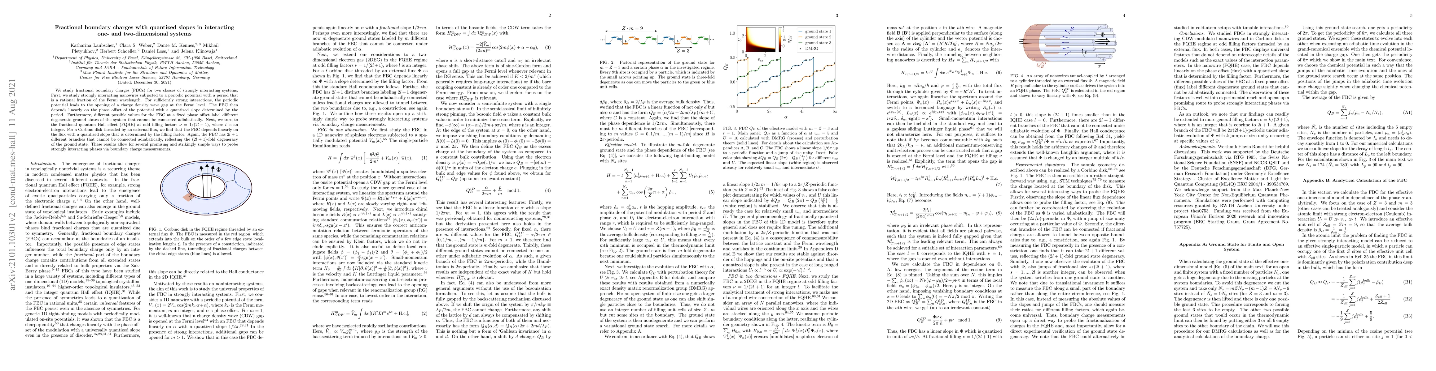We study fractional boundary charges (FBCs) for two classes of strongly interacting systems. First, we study strongly interacting nanowires subjected to a periodic potential with a period that is a rational fraction of the Fermi wavelength. For sufficiently strong interactions, the periodic potential leads to the opening of a charge density wave gap at the Fermi level. The FBC then depends linearly on the phase offset of the potential with a quantized slope determined by the period. Furthermore, different possible values for the FBC at a fixed phase offset label different degenerate ground states of the system that cannot be connected adiabatically. Next, we turn to the fractional quantum Hall effect (FQHE) at odd filling factors $\nu=1/(2l+1)$, where $l$ is an integer. For a Corbino disk threaded by an external flux, we find that the FBC depends linearly on the flux with a quantized slope that is determined by the filling factor. Again, the FBC has $2l+1$ different branches that cannot be connected adiabatically, reflecting the $(2l+1)$-fold degeneracy of the ground state. These results allow for several promising and strikingly simple ways to probe strongly interacting phases via boundary charge measurements.