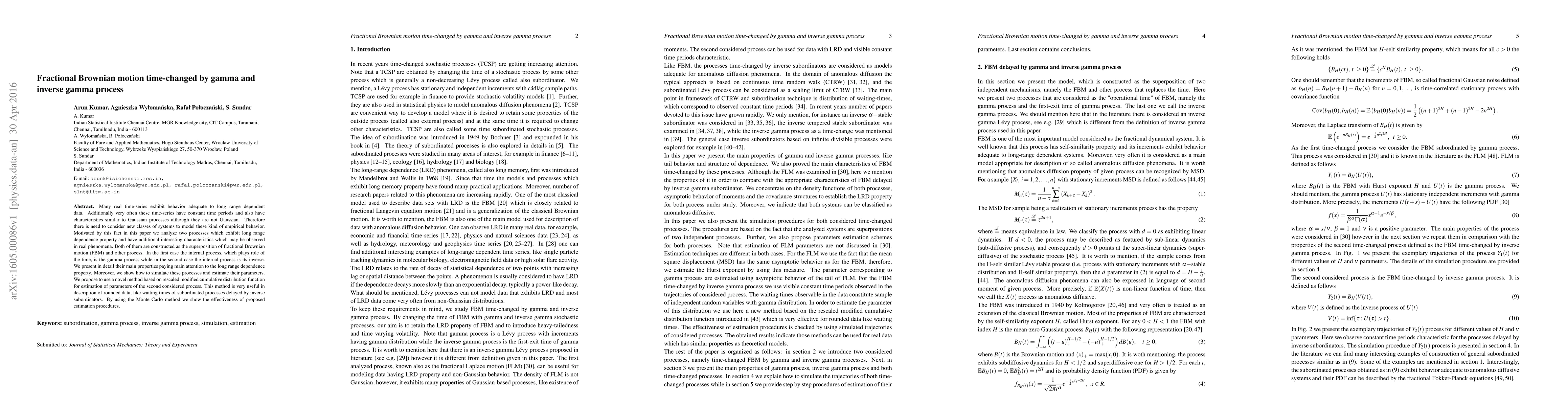 Many real time-series exhibit behavior adequate to long range dependent data. Additionally very often these time-series have constant time periods and also have characteristics similar to Gaussian processes although they are not Gaussian. Therefore there is need to consider new classes of systems to model these kind of empirical behavior. Motivated by this fact in this paper we analyze two processes which exhibit long range dependence property and have additional interesting characteristics which may be observed in real phenomena. Both of them are constructed as the superposition of fractional Brownian motion (FBM) and other process. In the first case the internal process, which plays role of the time, is the gamma process while in the second case the internal process is its inverse. We present in detail their main properties paying main attention to the long range dependence property. Moreover, we show how to simulate these processes and estimate their parameters. We propose to use a novel method based on rescaled modified cumulative distribution function for estimation of parameters of the second considered process. This method is very useful in description of rounded data, like waiting times of subordinated processes delayed by inverse subordinators. By using the Monte Carlo method we show the effectiveness of proposed estimation procedures.