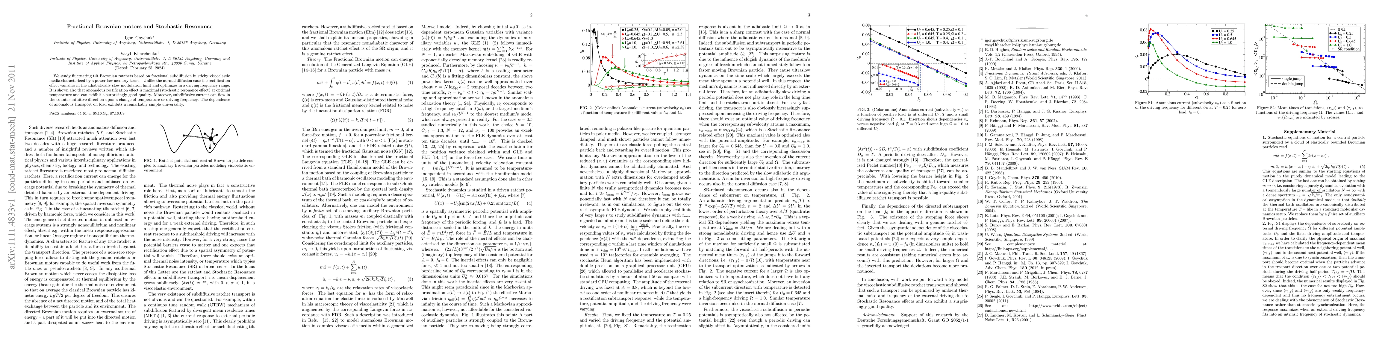 We study fluctuating tilt Brownian ratchets based on fractional subdiffusion in sticky viscoelastic media characterized by a power law memory kernel. Unlike the normal diffusion case the rectification effect vanishes in the adiabatically slow modulation limit and optimizes in a driving frequency range. It is shown also that anomalous rectification effect is maximal (stochastic resonance effect) at optimal temperature and can exhibit a surprisingly good quality. Moreover, subdiffusive current can flow in the counter-intuitive direction upon a change of temperature or driving frequency. The dependence of anomalous transport on load exhibits a remarkably simple universality.