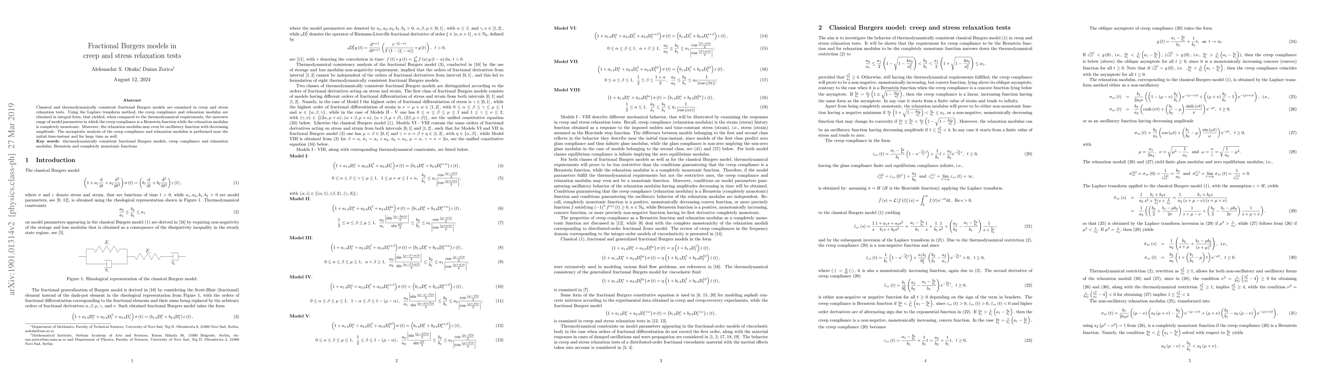 This paper investigates classical and thermodynamically consistent fractional Burgers models through creep and stress relaxation tests, deriving the creep compliance and relaxation modulus using Laplace transforms. The study finds that the creep compliance is a Bernstein function within a specific parameter range, while the relaxation modulus can be completely monotonic or even an oscillatory function with decreasing amplitude, as analyzed asymptotically for both short and long times.