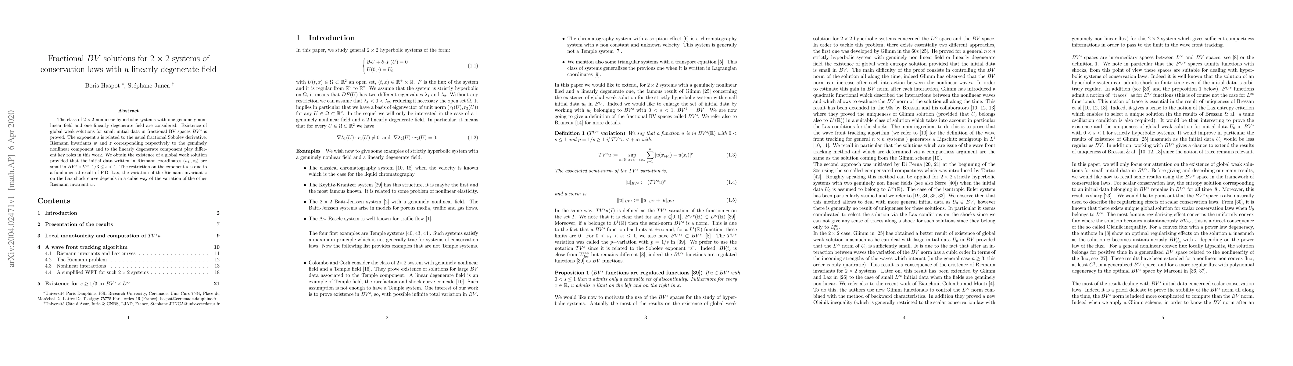 The class of $2\times 2$ nonlinear hyperbolic systems with one genuinely nonlinear field and one linearly degenerate field are considered. Existence of global weak solutions for small initial data in fractional BV spaces $BV^s$ is proved. The exponent $s$ is related to the usual fractional Sobolev derivative. Riemann invariants $w$ and $z$ corresponding respectively to the genuinely nonlinear component and to the linearly degenerate component play different key roles in this work. We obtain the existence of a global weak solution provided that the initial data written in Riemann coordinates $ (w_0,z_0)$ are small in $ BV^s \times L^\infty $, $1/3 \leq s<1$. The restriction on the exponent $s$ is due to a fundamental result of P.D. Lax, the variation of the Riemann invariant $z$ on the Lax shock curve depends in a cubic way of the variation of the other Riemann invariant $w$.