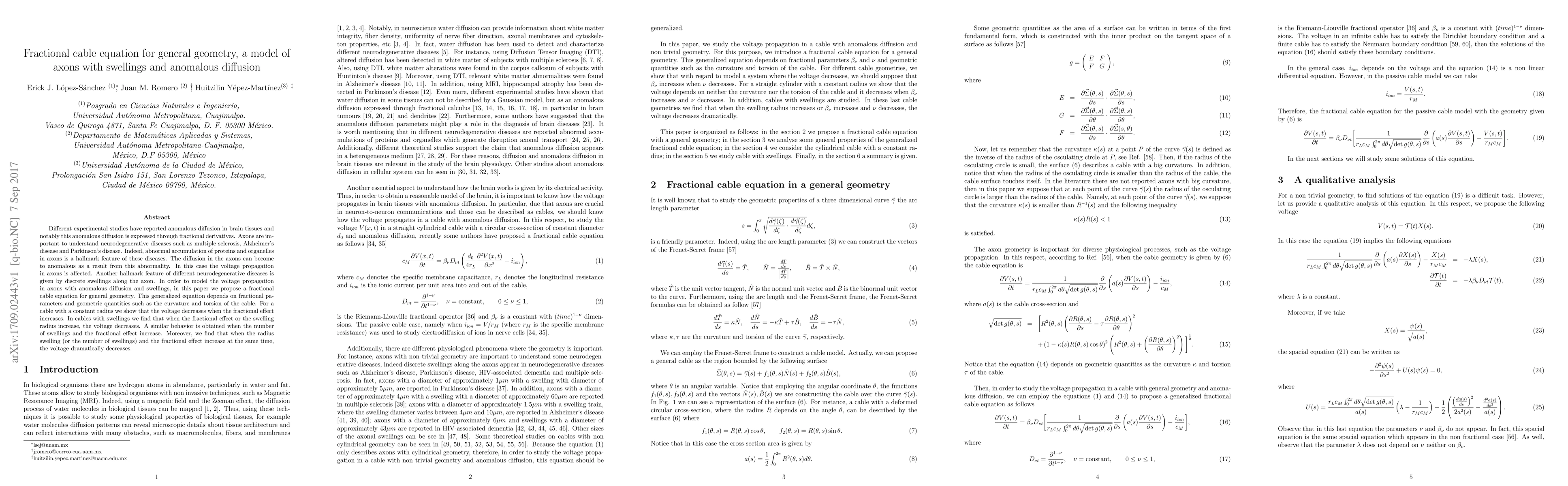 This paper proposes a fractional cable equation to model voltage propagation in axons with anomalous diffusion and swellings, influenced by geometric factors like curvature and torsion. The study finds that increased fractional effects and swellings lead to a significant decrease in voltage, highlighting their impact on neurodegenerative diseases.