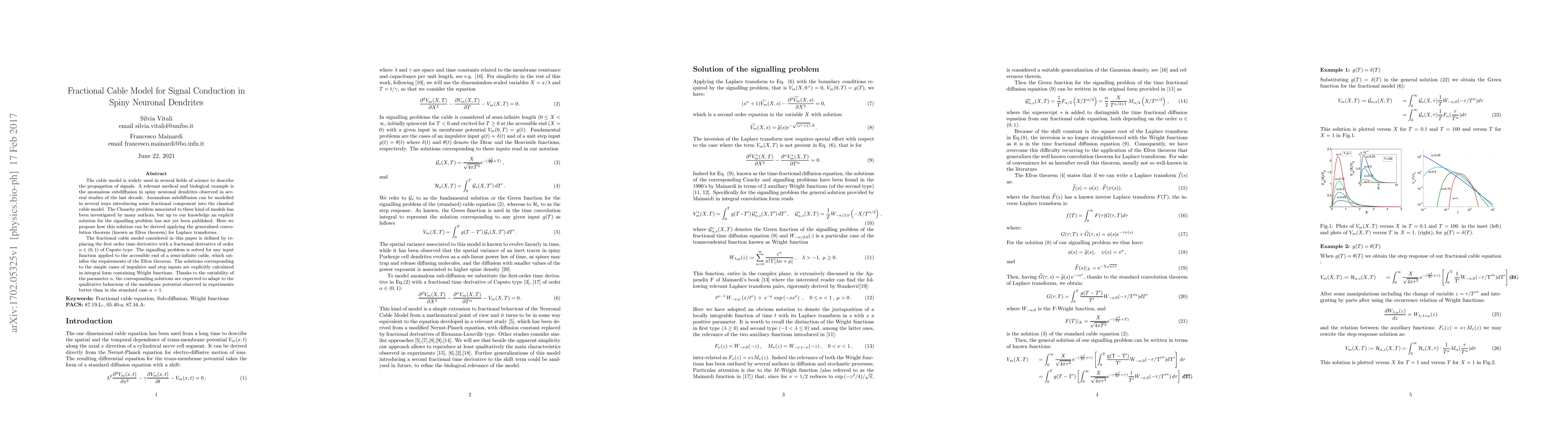 This paper proposes a fractional cable model to describe anomalous subdiffusion in spiny neuronal dendrites, replacing the first-order time derivative with a Caputo fractional derivative. An explicit solution for the signalling problem is derived using the generalized convolution theorem, providing integral solutions for impulsive and step inputs that better match experimental observations than the standard model.