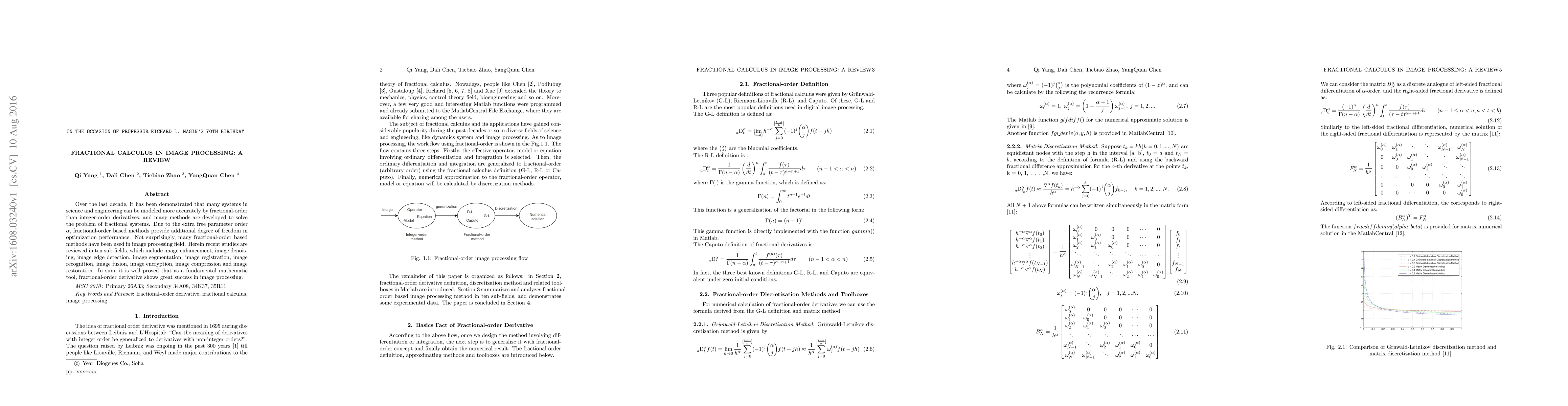 This paper reviews the application of fractional calculus in various image processing techniques, highlighting its advantages over traditional integer-order methods. It covers ten sub-fields, demonstrating fractional-order derivatives' effectiveness in tasks like enhancement, denoising, and recognition, underscoring their potential as a powerful mathematical tool.
