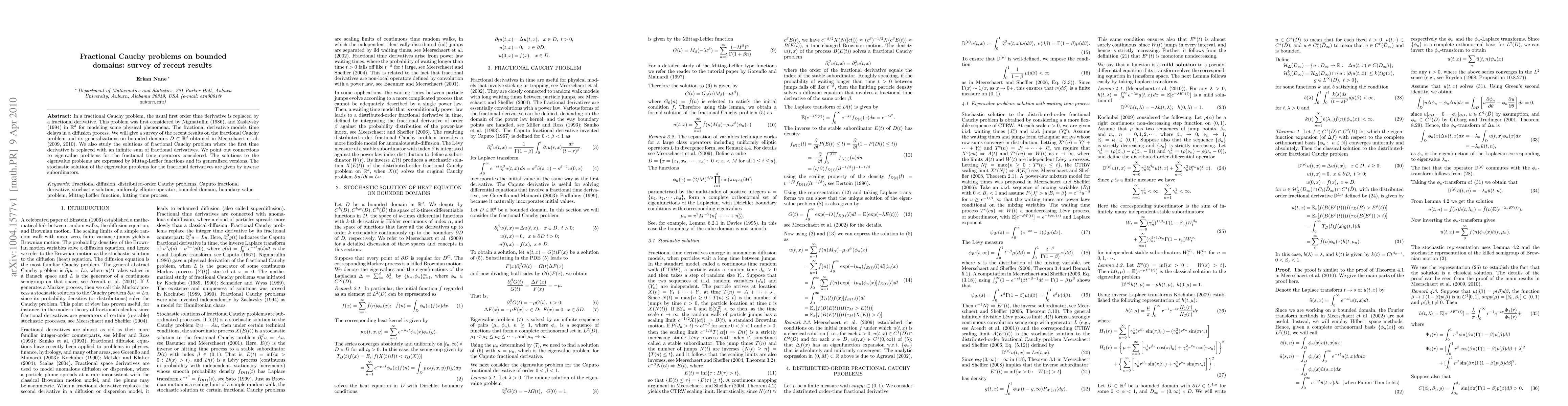 This paper surveys recent advancements in fractional Cauchy problems on bounded domains, replacing traditional first-order time derivatives with fractional derivatives to model time delays in diffusion processes. It highlights solutions involving Mittag-Leffler functions and stochastic solutions via inverse subordinators, linking these results to eigenvalue problems for fractional time operators.