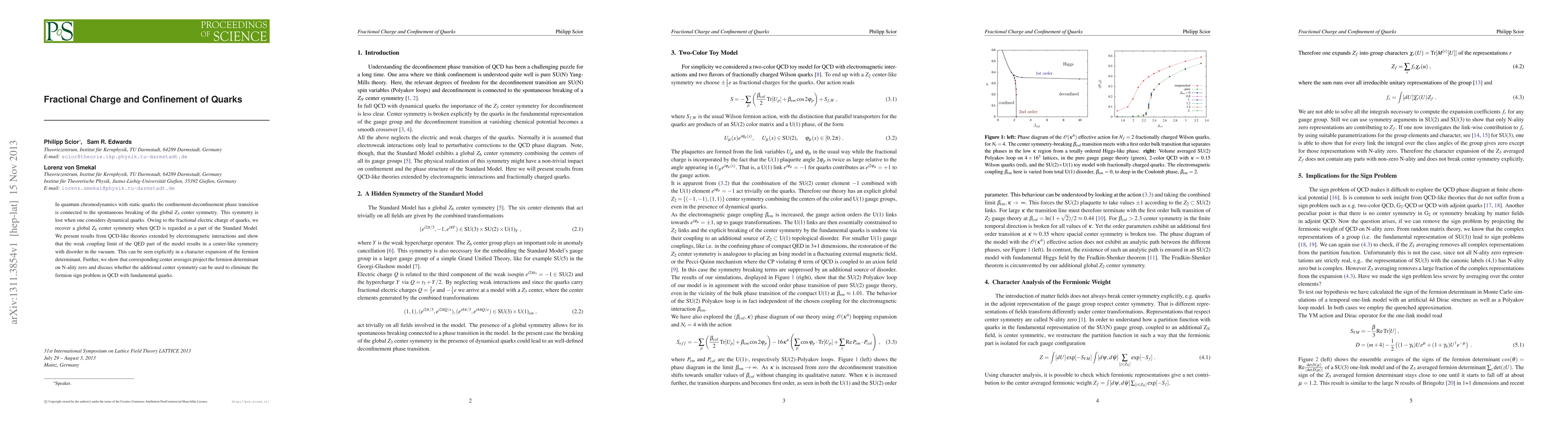 In quantum chromodynamics with static quarks the confinement-deconfinement phase transition is connected to the spontaneous breaking of the global Z3 center symmetry. This symmetry is lost when one considers dynamical quarks. Owing to the fractional electric charge of quarks, we recover a global Z6 center symmetry when QCD is regarded as a part of the Standard Model. We present results from QCD-like theories extended by electromagnetic interactions and show that the weak coupling limit of the QED part of the model results in a center-like symmetry with disorder in the vacuum. This can be seen explicitly in a character expansion of the fermion determinant. Further, we show that corresponding center averages project the fermion determinant on N-ality zero and discuss whether the additional center symmetry can be used to eliminate the fermion sign problem in QCD with fundamental quarks.