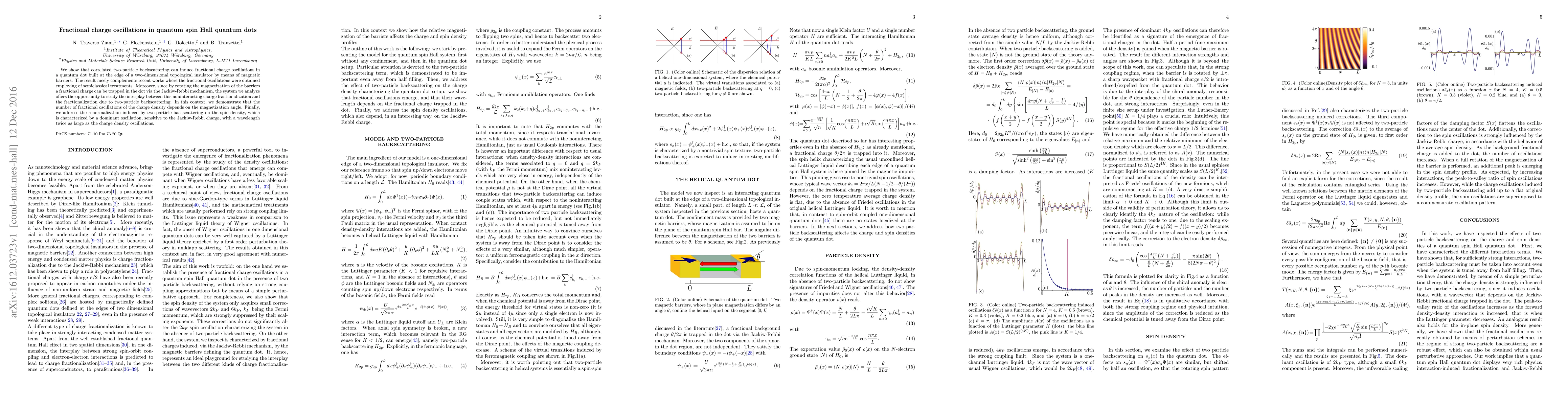 We show that correlated two-particle backscattering can induce fractional charge oscillations in a quantum dot built at the edge of a two-dimensional topological insulator by means of magnetic barriers. The result nicely complements recent works where the fractional oscillations were obtained employing of semiclassical treatments. Moreover, since by rotating the magnetization of the barriers a fractional charge can be trapped in the dot via the Jackiw-Rebbi mechanism, the system we analyze offers the opportunity to study the interplay between this noninteracting charge fractionalization and the fractionalization due to two-particle backscattering. In this context, we demonstrate that the number of fractional oscillations of the charge density depends on the magnetization angle. Finally, we address the renormalization induced by two-particle backscattering on the spin density, which is characterized by a dominant oscillation, sensitive to the Jackiw-Rebbi charge, with a wavelength twice as large as the charge density oscillations.