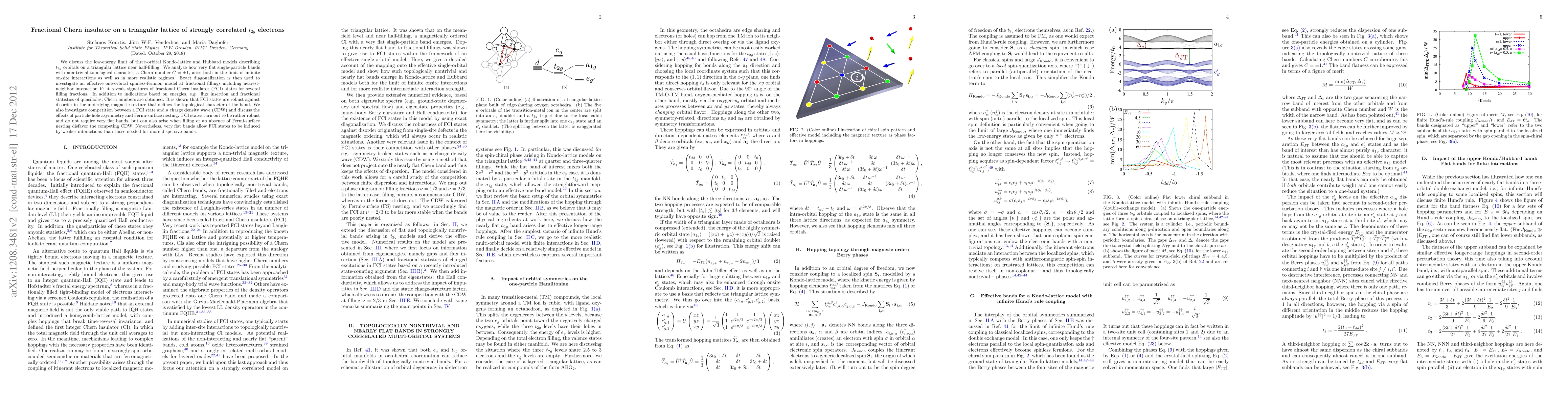 We discuss the low-energy limit of three-orbital Kondo-lattice and Hubbard models describing $t_{2g}$ orbitals on a triangular lattice near half-filling. We analyze how very flat bands with non-trivial topological character, a Chern number C=1, arise both in the limit of infinite on-site interactions as well as in more realistic regimes. Exact diagonalization is then used to investigate fractional filling of an effective one-band spinless-fermion model including nearest-neighbor interaction $V$; it reveals signatures of fractional Chern insulators (FCIs) for several filling fractions. In addition to indications based on energies, e.g. flux insertion and fractional statistics of quasiholes, Chern numbers are obtained. It is shown that FCIs are robust against disorder in the underlying magnetic texture that defines the topological character of the band. We also investigate competition between FCI states and a charge density wave (CDW) and discuss particle-hole asymmetry as well as Fermi-surface nesting. FCI states turn out to be rather robust and do not require very flat bands, but can also arise when filling or an absence of Fermi-surface nesting disfavor the competing CDW. Nevertheless, very flat bands allow FCI states to be induced by weaker interactions than those needed for more dispersive bands.