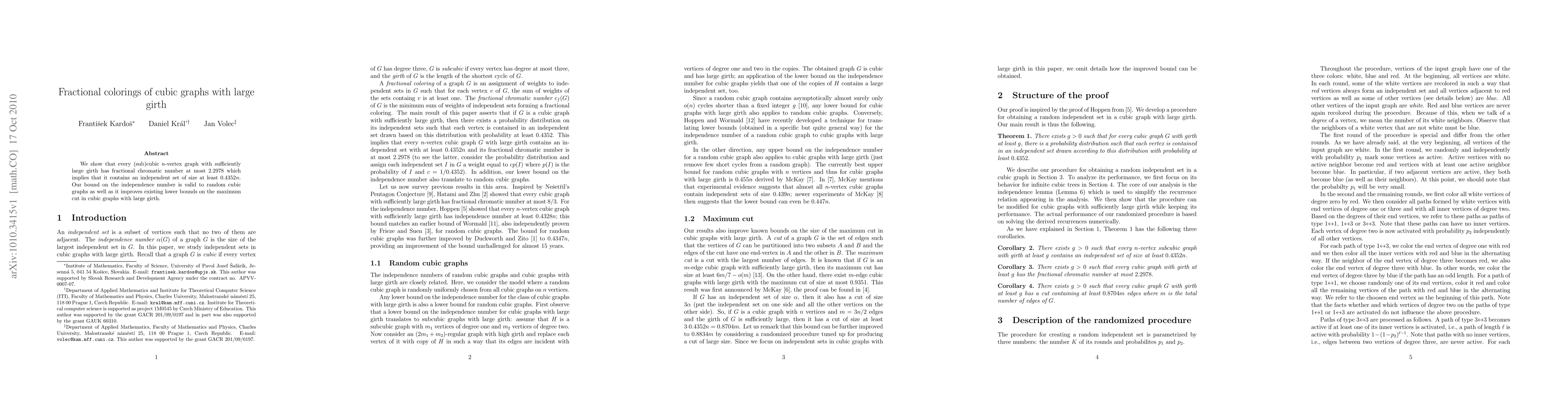 This paper demonstrates that (sub)cubic graphs with sufficiently large girth possess a fractional chromatic number of at most 2.2978, implying the existence of an independent set of size at least 0.4352n. The improved lower bounds also extend to random cubic graphs and enhance existing maximum cut estimates for such graphs.