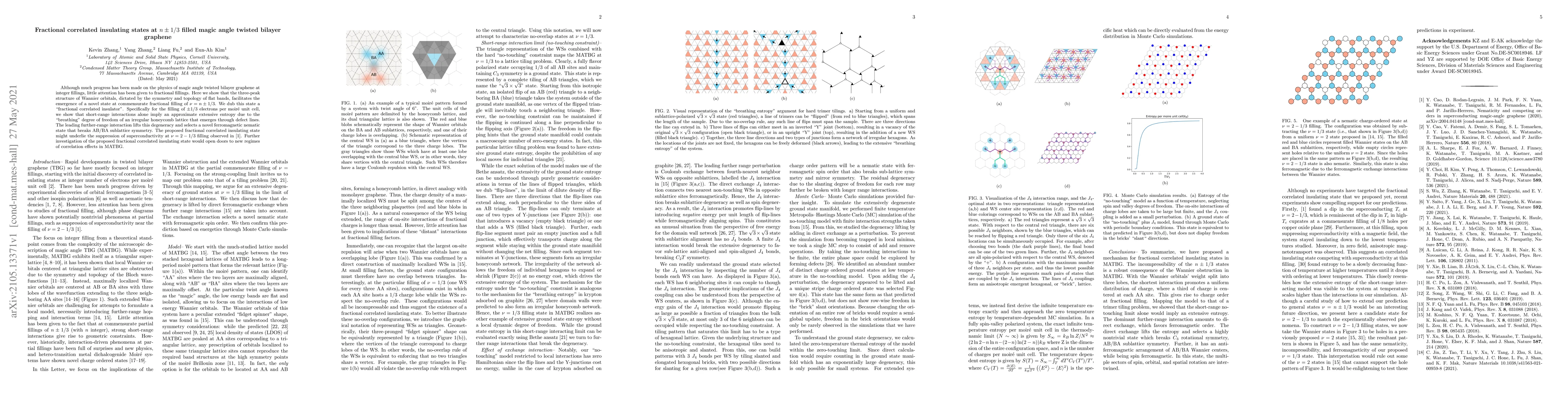 Although much progress has been made on the physics of magic angle twisted bilayer graphene at integer fillings, little attention has been given to fractional fillings. Here we show that the three-peak structure of Wannier orbitals, dictated by the symmetry and topology of flat bands, facilitates the emergence of a novel state at commensurate fractional filling of $\nu = n \pm 1/3$. We dub this state a "fractional correlated insulator". Specifically for the filling of $\pm 1/3$ electrons per moir\'{e} unit cell, we show that short-range interactions alone imply an approximate extensive entropy due to the "breathing" degree of freedom of an irregular honeycomb lattice that emerges through defect lines. The leading further-range interaction lifts this degeneracy and selects a novel ferromagnetic nematic state that breaks AB/BA sublattice symmetry. The proposed fractional correlated insulating state might underlie the suppression of superconductivity at $\nu = 2-1/3$ filling observed in arXiv:2004.04148. Further investigation of the proposed fractional correlated insulating state would open doors to new regimes of correlation effects in MATBG.