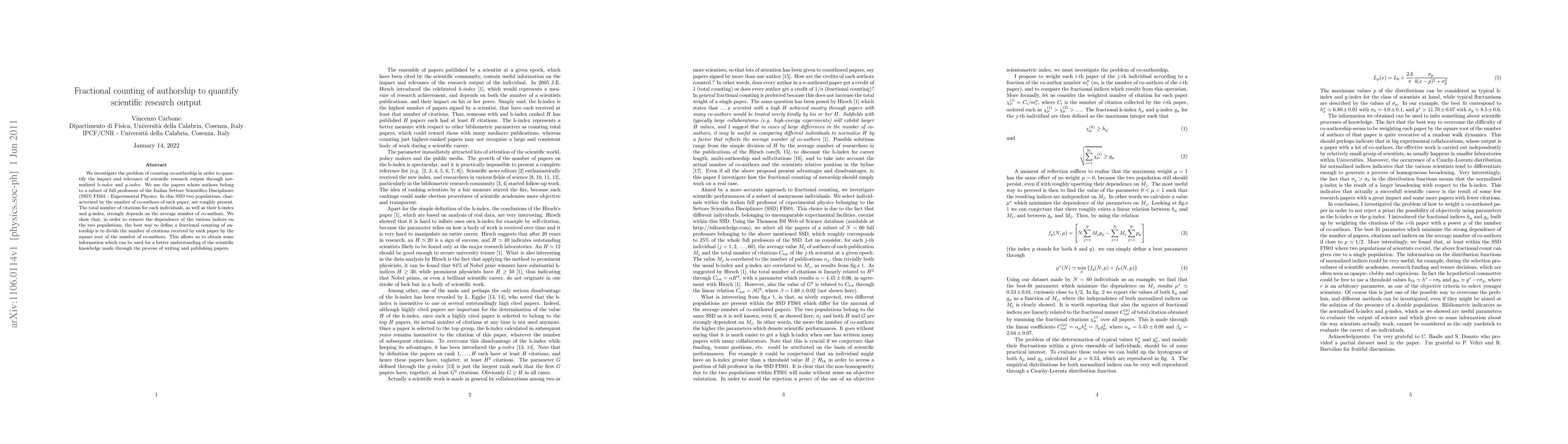 This paper proposes a fractional counting method to normalize the h-index and g-index for scientific research output, focusing on full professors in the Italian SSD FIS01 - Experimental Physics. It suggests dividing the citations by the square root of co-authors to mitigate the impact of varying co-authorship on these indices.