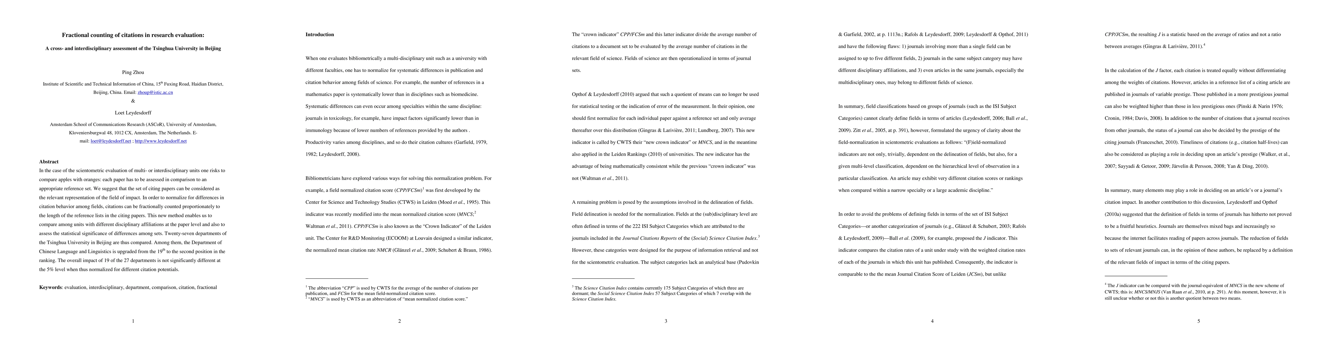 In the case of the scientometric evaluation of multi- or interdisciplinary units one risks to compare apples with oranges: each paper has to be assessed in comparison to an appropriate reference set. We suggest that the set of citing papers can be considered as the relevant representation of the field of impact. In order to normalize for differences in citation behavior among fields, citations can be fractionally counted proportionately to the length of the reference lists in the citing papers. This new method enables us to compare among units with different disciplinary affiliations at the paper level and also to assess the statistical significance of differences among sets. Twenty-seven departments of the Tsinghua University in Beijing are thus compared. Among them, the Department of Chinese Language and Linguistics is upgraded from the 19th to the second position in the ranking. The overall impact of 19 of the 27 departments is not significantly different at the 5% level when thus normalized for different citation potentials.