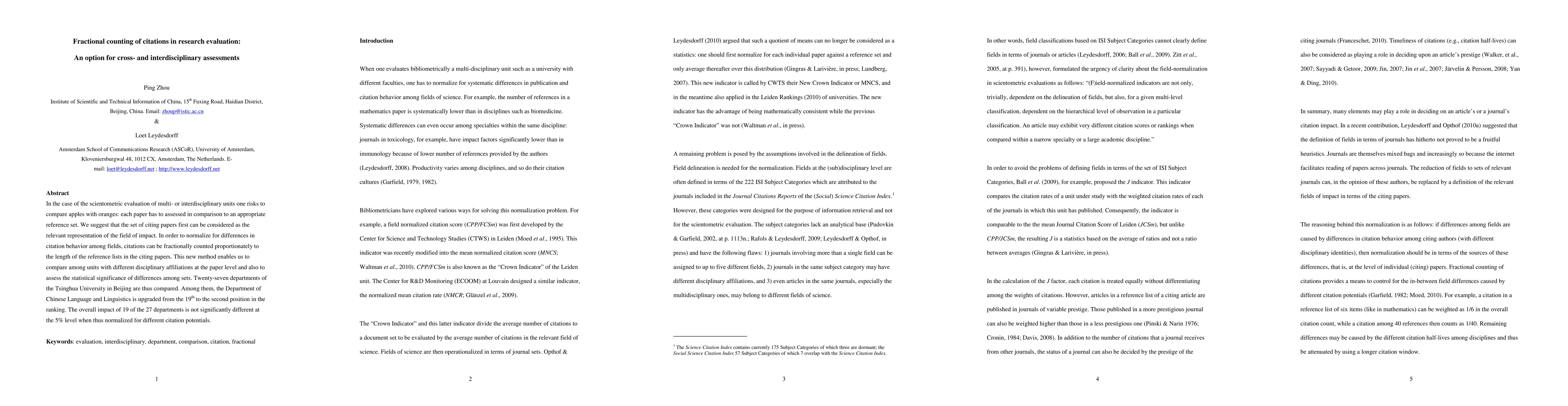 In the case of the scientometric evaluation of multi- or interdisciplinary units one risks to compare apples with oranges: each paper has to assessed in comparison to an appropriate reference set. We suggest that the set of citing papers first can be considered as the relevant representation of the field of impact. In order to normalize for differences in citation behavior among fields, citations can be fractionally counted proportionately to the length of the reference lists in the citing papers. This new method enables us to compare among units with different disciplinary affiliations at the paper level and also to assess the statistical significance of differences among sets. Twenty-seven departments of the Tsinghua University in Beijing are thus compared. Among them, the Department of Chinese Language and Linguistics is upgraded from the 19th to the second position in the ranking. The overall impact of 19 of the 27 departments is not significantly different at the 5% level when thus normalized for different citation potentials.