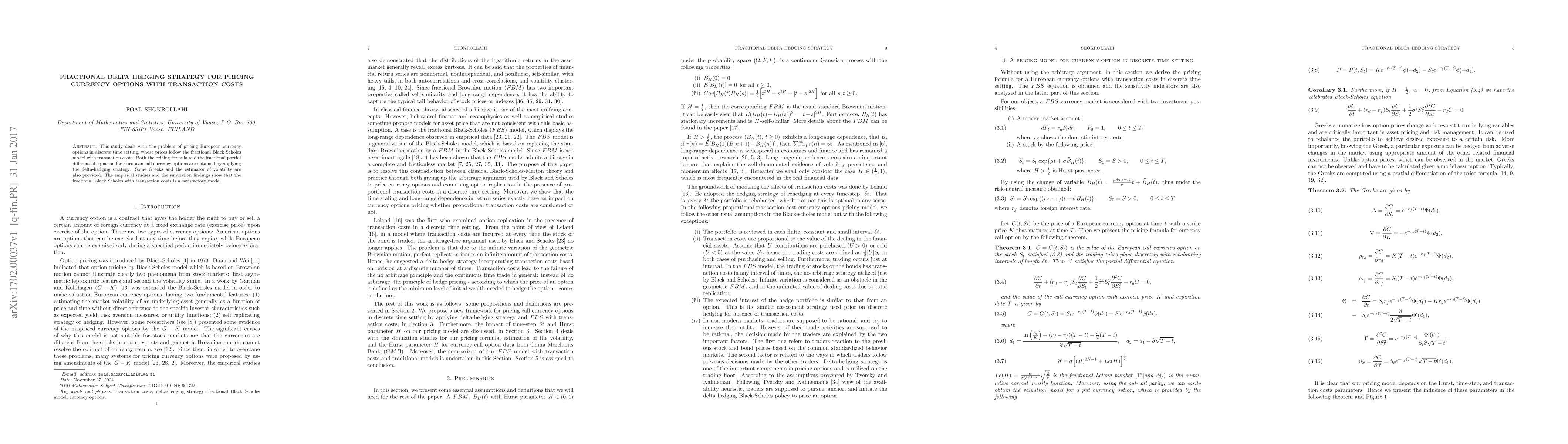 This paper develops a fractional delta-hedging strategy for pricing European currency options under a fractional Black-Scholes model with transaction costs, providing both a pricing formula and a fractional partial differential equation. Empirical studies validate the effectiveness of the proposed model.
