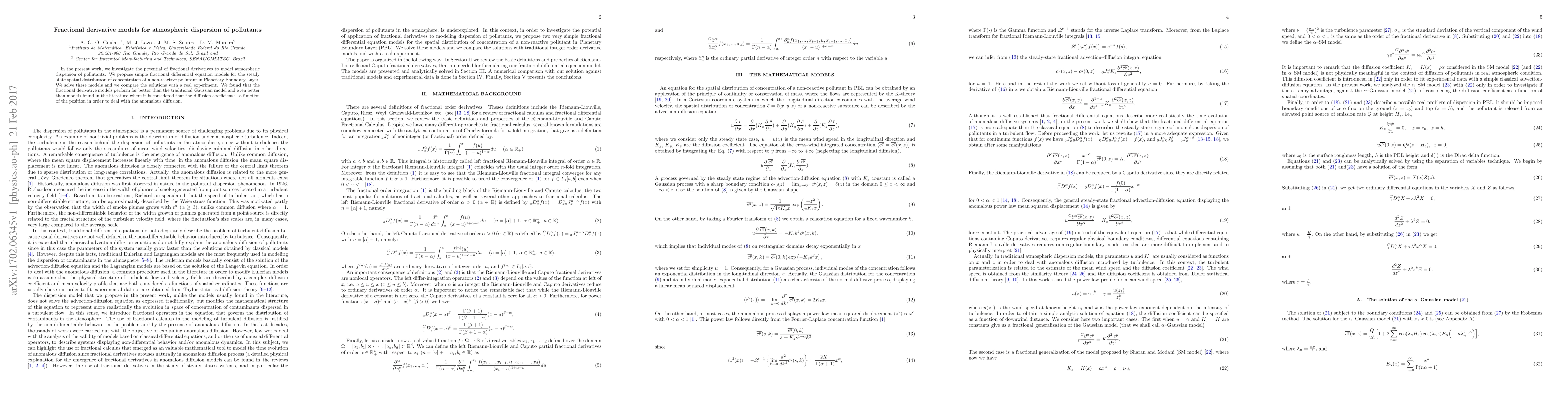 This paper proposes fractional derivative models for the atmospheric dispersion of pollutants, demonstrating their superior performance compared to traditional Gaussian models and other advanced models, based on both theoretical solutions and real experimental data.