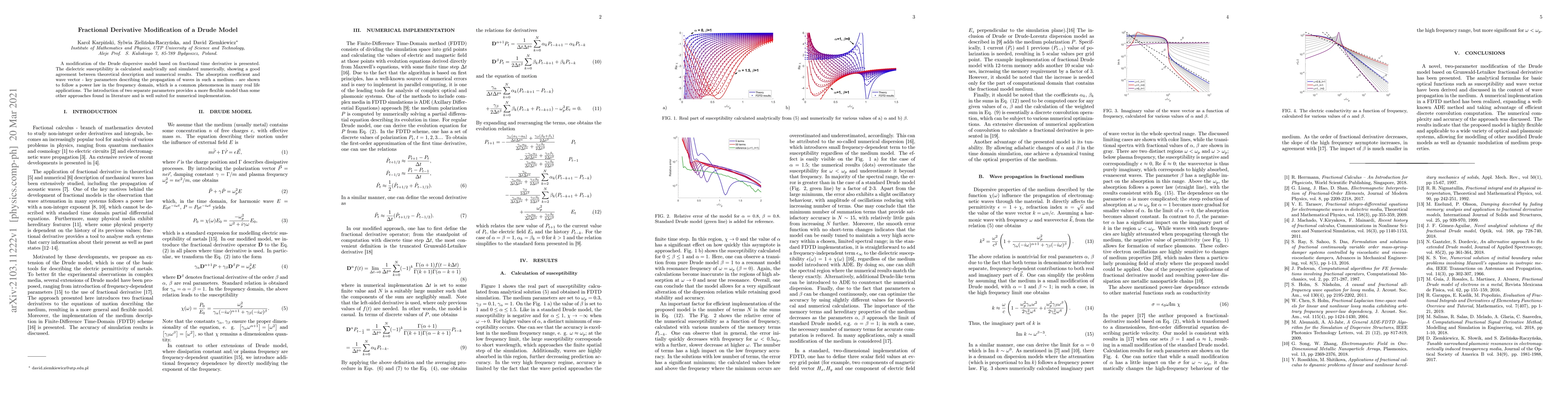 A modification of the Drude dispersive model based on fractional time derivative is presented. The dielectric susceptibility is calculated analytically and simulated numerically, showing a good agreement between theoretical description and numerical results. The absorption coefficient and wave vector -- key parameters describing the propagation of waves in such a medium -- are shown to follow a power law in the frequency domain, which is a common phenomenon in many real life applications. The introduction of two separate parameters provides a more flexible model than some other approaches found in literature and is well suited for numerical implementation.