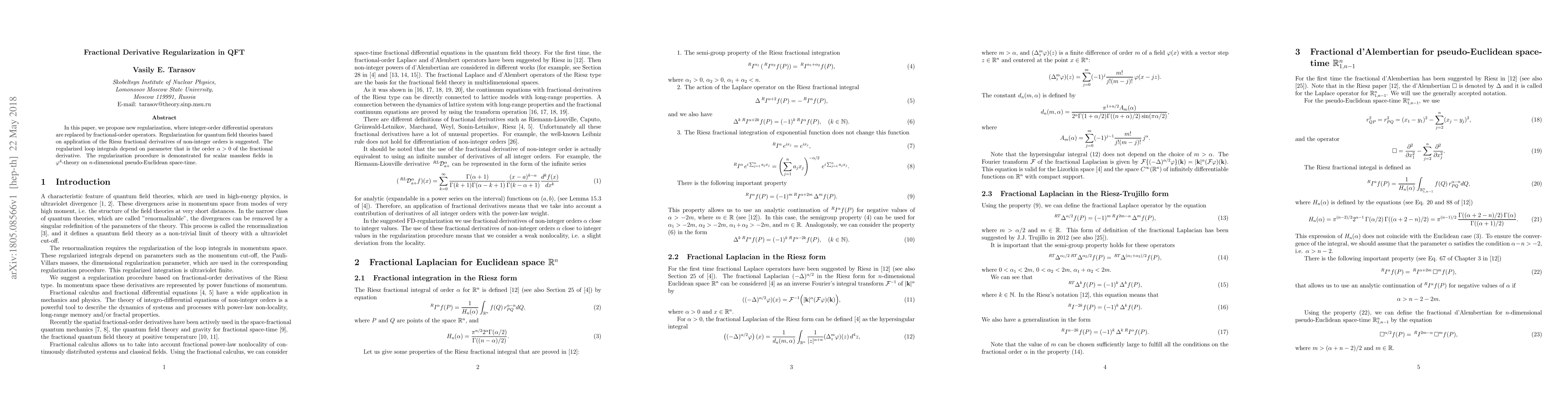 This paper introduces a novel regularization method in quantum field theory (QFT) by replacing integer-order differential operators with fractional-order operators based on Riesz fractional derivatives. The proposed regularization is demonstrated for scalar massless fields in phi^4-theory on n-dimensional pseudo-Euclidean space-time.