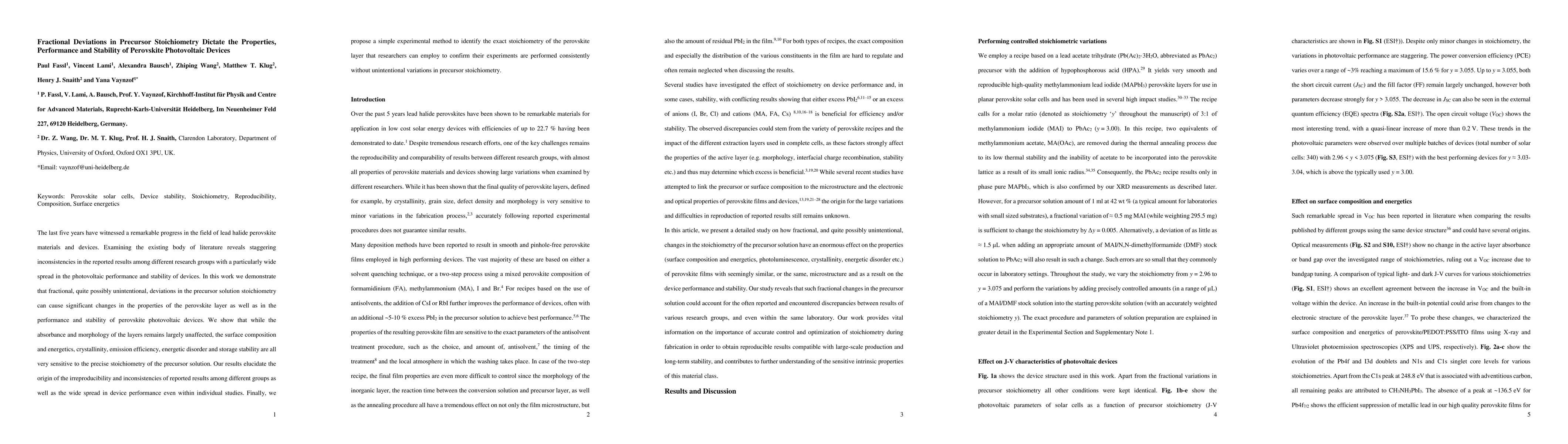 This paper investigates how minor, unintentional deviations in precursor stoichiometry in lead halide perovskite materials significantly affect the properties, performance, and stability of perovskite photovoltaic devices. The study reveals that while absorbance and morphology remain largely unchanged, factors like surface composition, energetics, crystallinity, and emission efficiency are highly sensitive to precise stoichiometry, explaining inconsistencies in reported results and device performance.