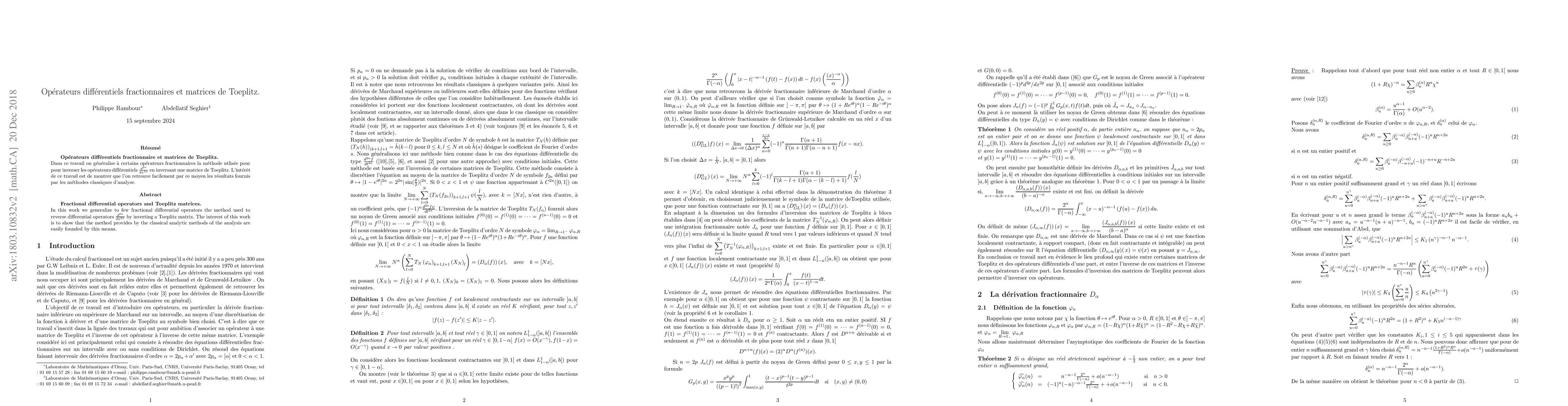 In this work we generalize to few fractional differential operators the method used to reverse differential operators $\frac{d^{2n}}{dx^{2n}}$ by inverting a Toeplitz matrix. The interest of this work is to show that the method provides by the classical analytic methods of the analysis are easily founded by this means. (Titre: Op\'erateurs diff\'erentiels fractionnaires et matrices de Toeplitz) Op\'erateurs diff\'erentiels fractionnaire et matrices de Toeplitz.) Dans ce travail on g\'en\'eralise \`a certains op\'erateurs fractionnaires la m\'ethode utlis\'ee pour pour inverser les op\'erateurs diff\'erentiels $\frac{d^{2n}}{dx^{2n}}$ en inversant une matrice de Toeplitz. L'int\'er\^et de ce travail est de montrer que l'on retrouve facilement par ce moyen les r\'esultats fournis par les m\'ethodes classiques d'analyse.