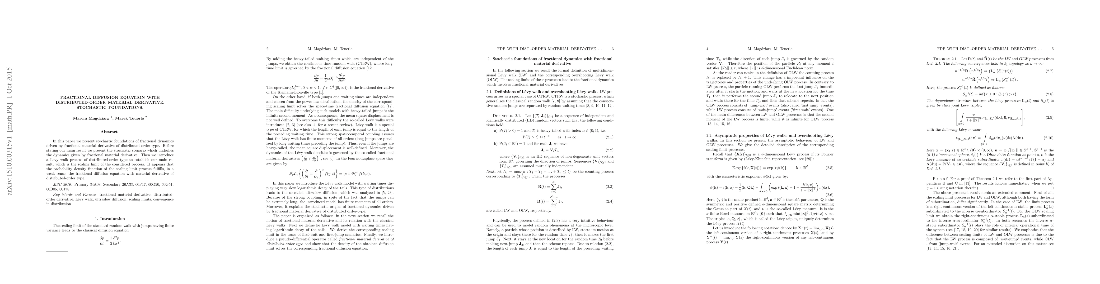 This paper develops stochastic foundations for fractional dynamics using a fractional material derivative of distributed order. It employs a Lévy walk process of distributed-order type to derive a scaling limit that weakly satisfies the fractional diffusion equation with a distributed-order material derivative.