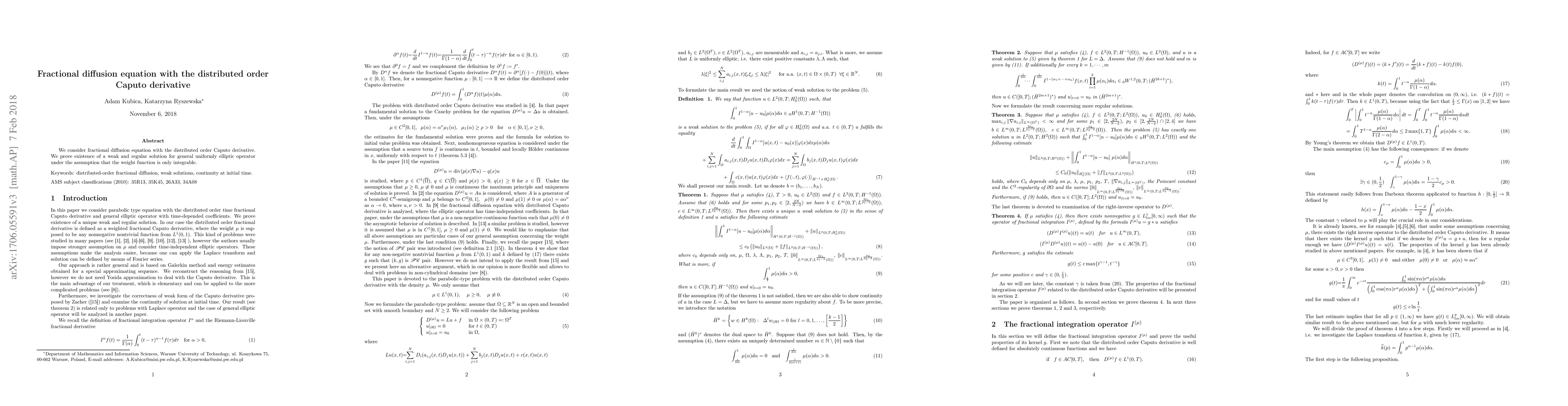 Summary: This paper studies a fractional diffusion equation featuring a distributed order Caputo derivative. It establishes the existence of weak and regular solutions for general uniformly elliptic operators, assuming only integrability of the weight function.