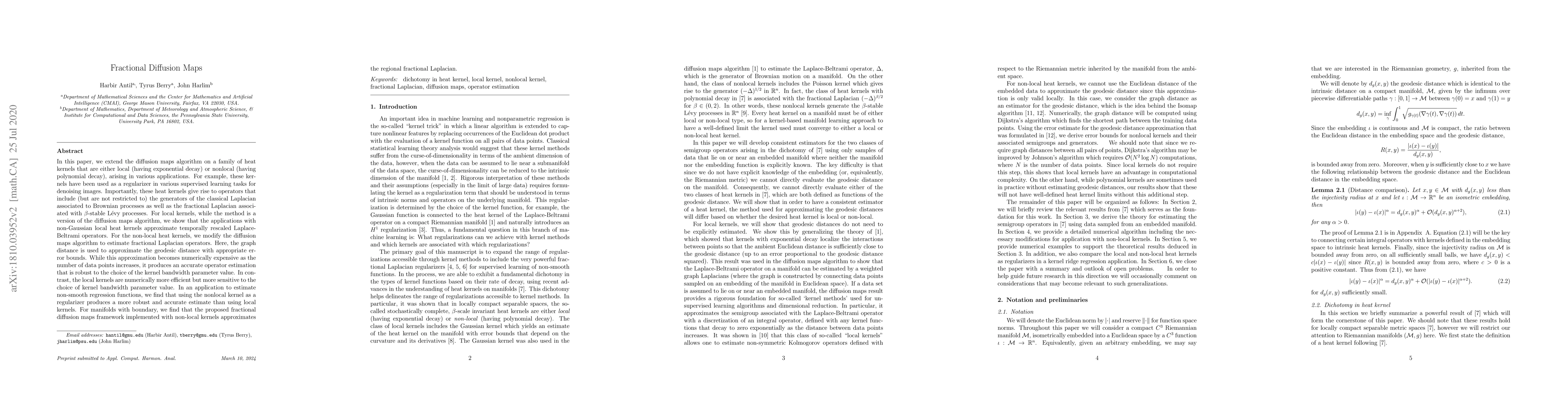In this paper, we extend the diffusion maps algorithm on a family of heat kernels that are either local (having exponential decay) or nonlocal (having polynomial decay), arising in various applications. For example, these kernels have been used as a regularizer in various supervised learning tasks for denoising images. Importantly, these heat kernels give rise to operators that include (but are not restricted to) the generators of the classical Laplacian associated to Brownian processes as well as the fractional Laplacian associated with $\beta$-stable L\'evy processes. For local kernels, while the method is a version of the diffusion maps algorithm, we show that the applications with non-Gaussian local heat kernels approximate temporally rescaled Laplace-Beltrami operators. For the non-local heat kernels, we modify the diffusion maps algorithm to estimate fractional Laplacian operators. Here, the graph distance is used to approximate the geodesic distance with appropriate error bounds. While this approximation becomes numerically expensive as the number of data points increases, it produces an accurate operator estimation that is robust to the choice of the kernel bandwidth parameter value. In contrast, the local kernels are numerically more efficient but more sensitive to the choice of kernel bandwidth parameter value. In an application to estimate non-smooth regression functions, we find that using the nonlocal kernel as a regularizer produces a more robust and accurate estimate than using local kernels. For manifolds with boundary, we find that the proposed fractional diffusion maps framework implemented with non-local kernels approximates the regional fractional Laplacian.