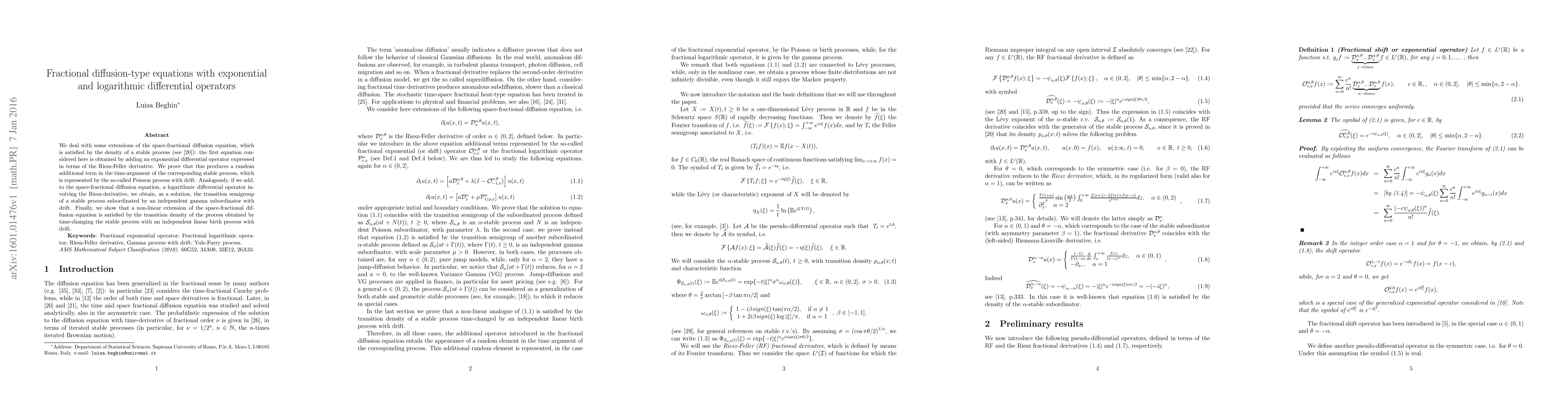 Researchers extend space-fractional diffusion equations to include exponential and logarithmic differential operators, producing solutions related to stable processes and Poisson processes with drift.