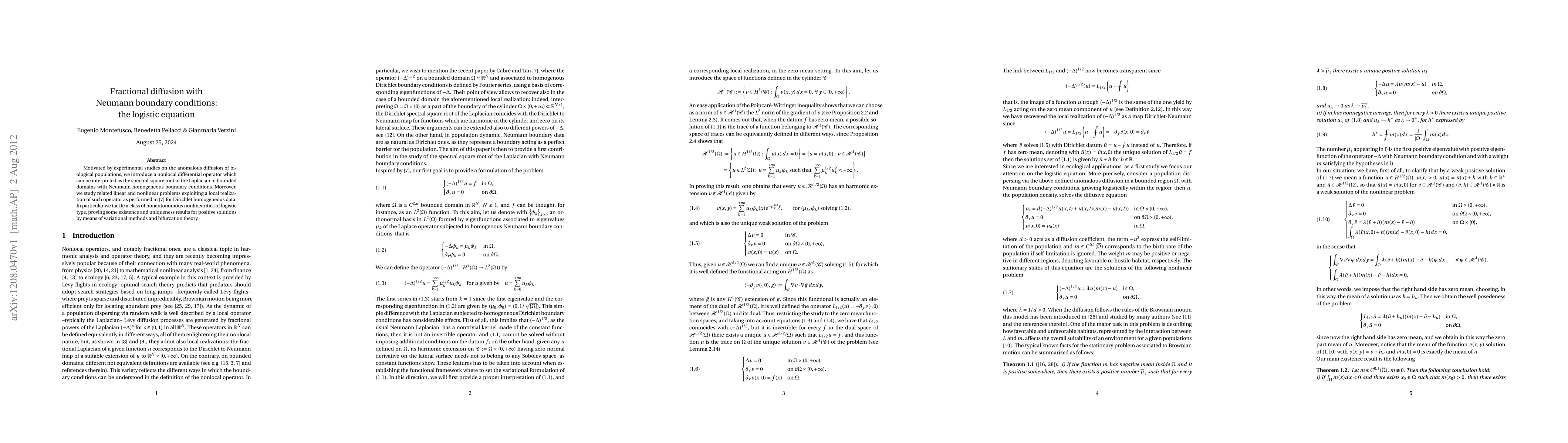 This paper explores fractional diffusion using a nonlocal differential operator, interpreted as the spectral square root of the Laplacian, with Neumann boundary conditions, and studies its application to logistic equation-based nonlinear problems. Existence and uniqueness of positive solutions are proven through variational methods and bifurcation theory.