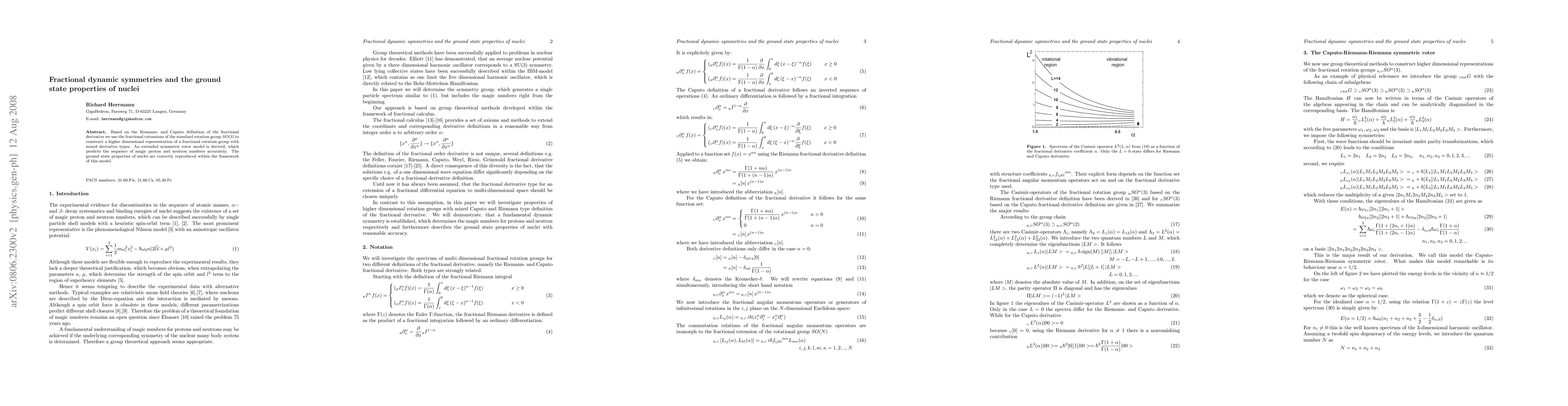 This paper constructs a fractional rotation group using Riemann- and Caputo fractional derivatives, deriving an extended symmetric rotor model that accurately predicts magic proton and neutron numbers and reproduces the ground state properties of nuclei.