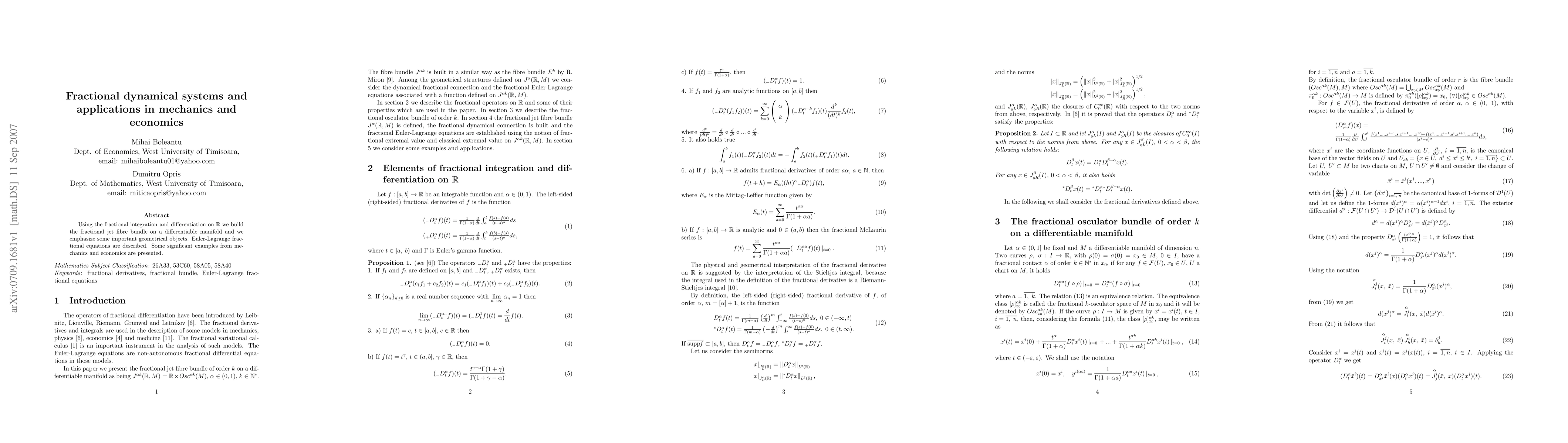 This paper introduces fractional dynamical systems, applying fractional calculus to mechanics and economics. It constructs fractional jet fiber bundles on differentiable manifolds and presents Euler-Lagrange fractional equations, supported by examples from both fields.
