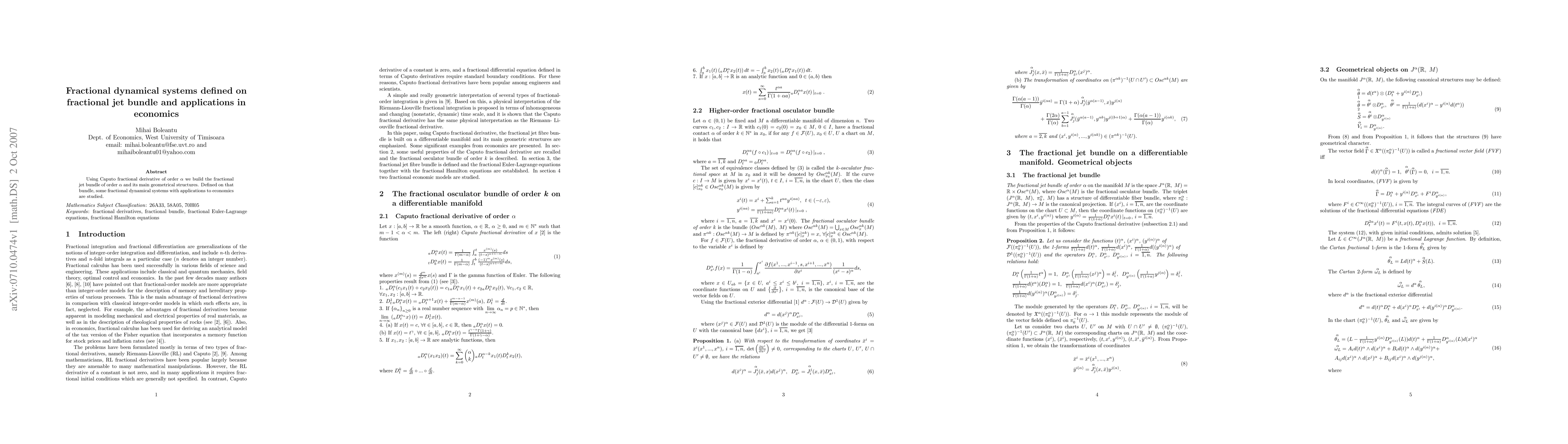 Summary: This paper constructs a fractional jet bundle using Caputo fractional derivatives and explores its geometric structures, then applies these constructs to develop fractional dynamical systems with economic implications.