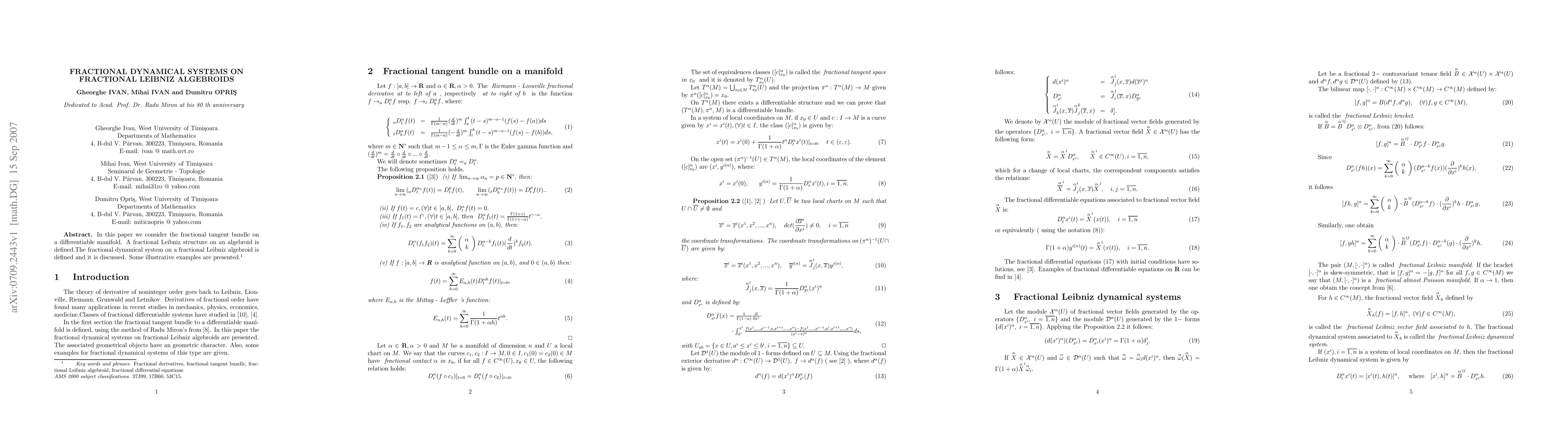 This paper defines fractional tangent bundles on manifolds and explores fractional Leibniz algebroids, providing geometric characterizations and discussing fractional dynamical systems within this new framework. Applications in mechanics, physics, and economics are implied.