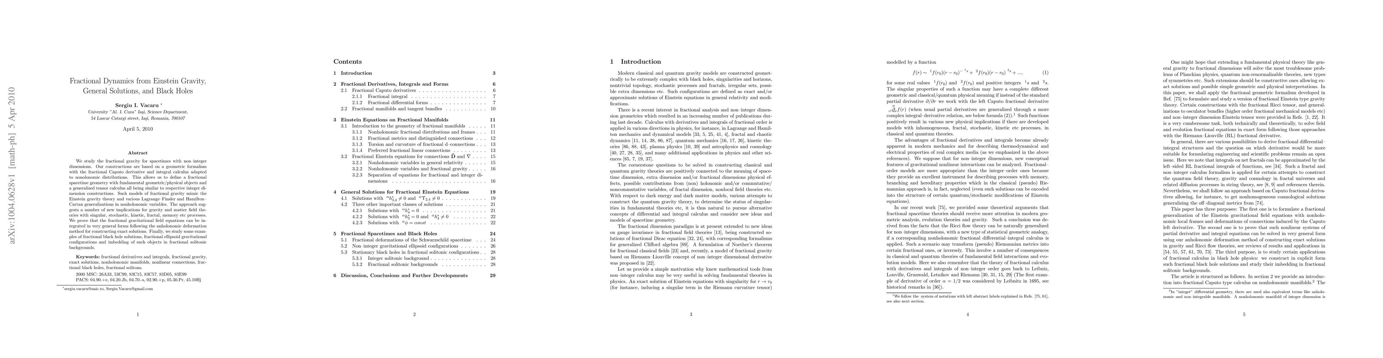 This paper explores fractional gravity in non-integer dimensional spacetimes using a geometric formalism with fractional Caputo derivatives. It proposes generalized tensor calculus and exact solutions for fractional gravitational field equations, and examines fractional black hole solutions and ellipsoid configurations.