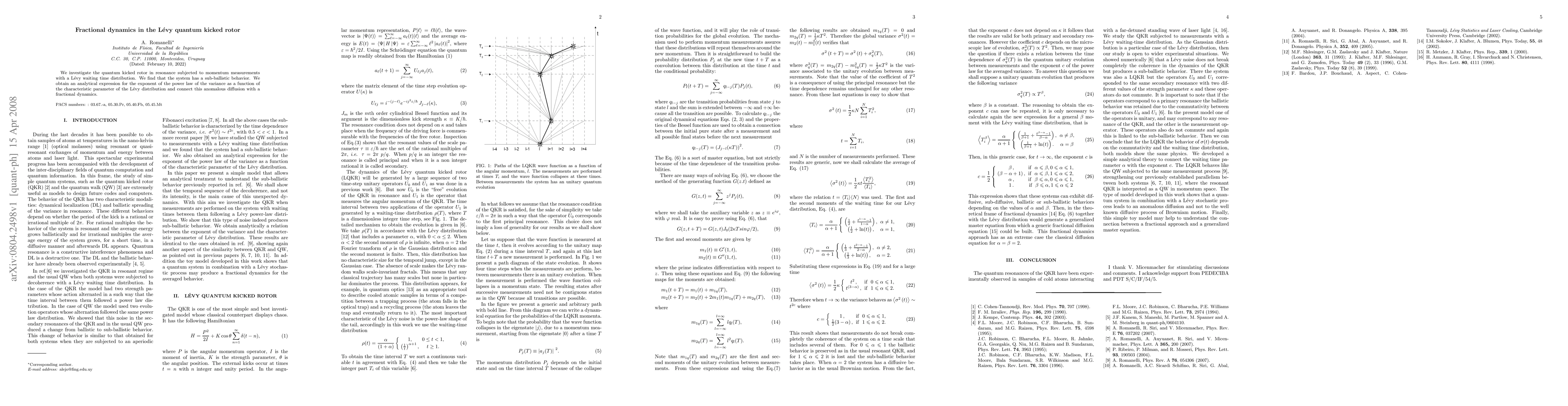 We investigate the quantum kicked rotor in resonance subjected to momentum measurements with a L\'evy waiting time distribution. We find that the system has a sub-ballistic behavior. We obtain an analytical expression for the exponent of the power law of the variance as a function of the characteristic parameter of the L\'evy distribution and connect this anomalous diffusion with a fractional dynamics.