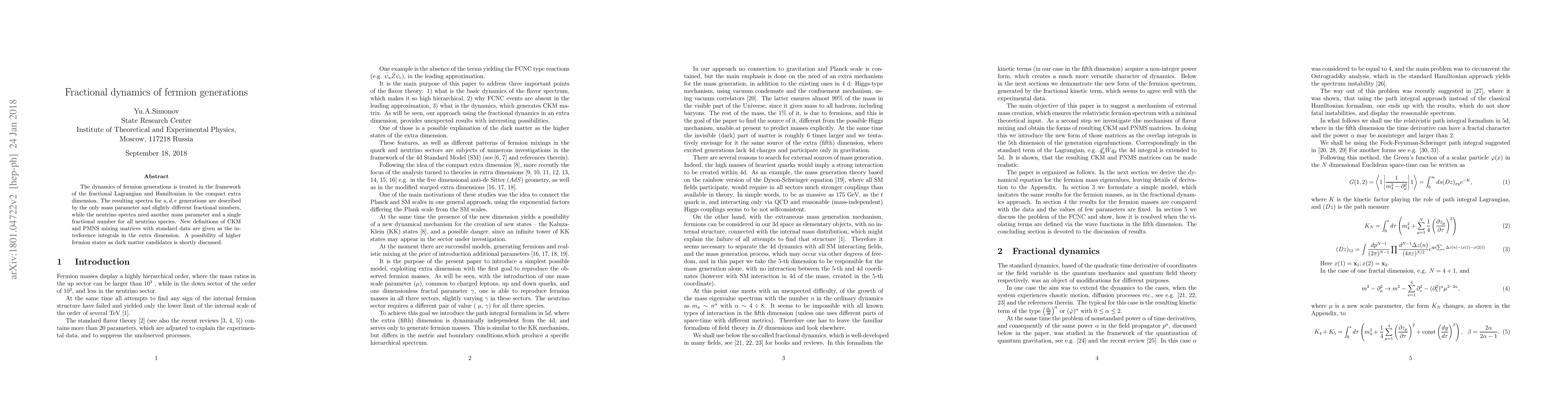 This paper explores fermion generation dynamics using fractional Lagrangian and Hamiltonian in a compact extra dimension, proposing spectra for u, d, e generations with a single mass parameter and fractional numbers, and a separate mass parameter for neutrino spectra. It also introduces new definitions for CKM and PMNS mixing matrices and briefly discusses higher fermion states as potential dark matter candidates.