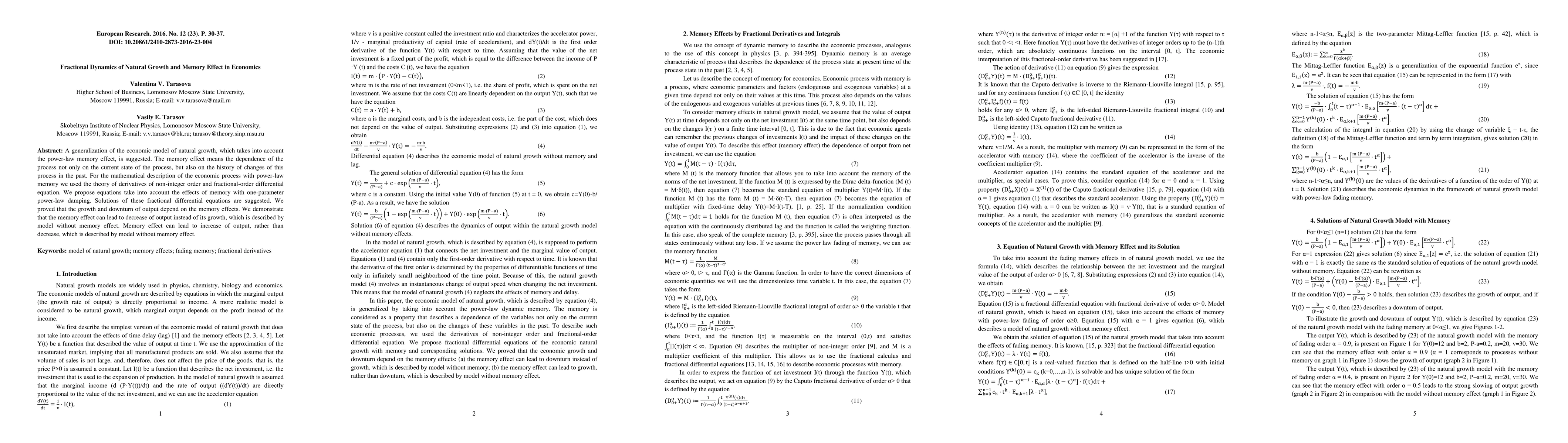 A generalization of the economic model of natural growth, which takes into account the power-law memory effect, is suggested. The memory effect means the dependence of the process not only on the current state of the process, but also on the history of changes of this process in the past. For the mathematical description of the economic process with power-law memory we used the theory of derivatives of non-integer order and fractional-order differential equation. We propose equations take into account the effects of memory with one-parameter power-law damping. Solutions of these fractional differential equations are suggested. We proved that the growth and downturn of output depend on the memory effects. We demonstrate that the memory effect can lead to decrease of output instead of its growth, which is described by model without memory effect. Memory effect can lead to increase of output, rather than decrease, which is described by model without memory effect.