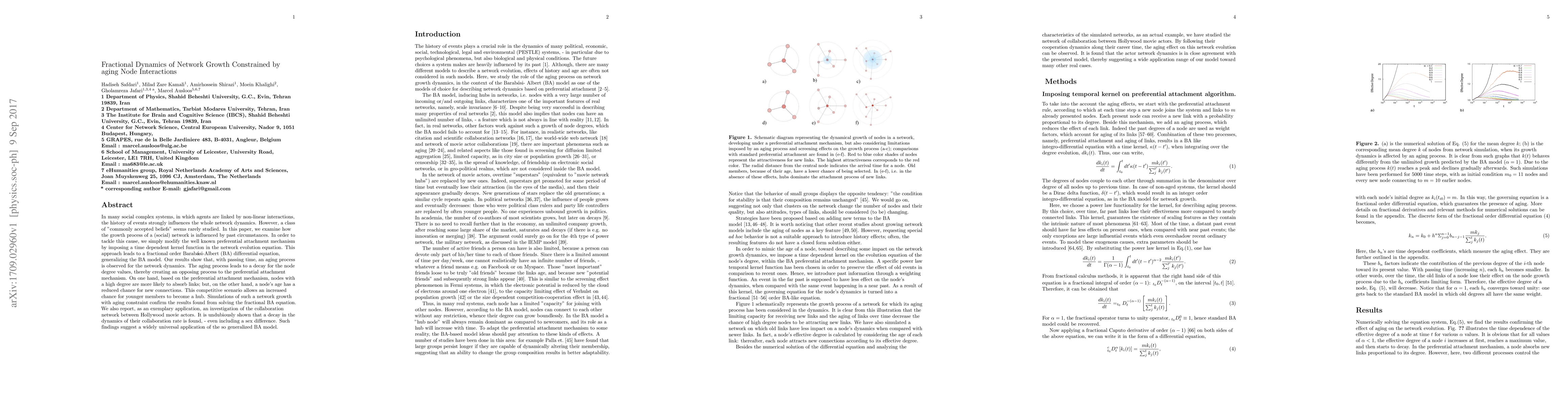 In many social complex systems, in which agents are linked by non-linear interactions, the history of events strongly influences the whole network dynamics. However, a class of "commonly accepted beliefs" seems rarely studied. In this paper, we examine how the growth process of a (social) network is influenced by past circumstances. In order to tackle this cause, we simply modify the well known preferential attachment mechanism by imposing a time dependent kernel function in the network evolution equation. This approach leads to a fractional order Barabasi-Albert (BA) differential equation, generalizing the BA model. Our results show that, with passing time, an aging process is observed for the network dynamics. The aging process leads to a decay for the node degree values, thereby creating an opposing process to the preferential attachment mechanism. On one hand, based on the preferential attachment mechanism, nodes with a high degree are more likely to absorb links; but, on the other hand, a node's age has a reduced chance for new connections. This competitive scenario allows an increased chance for younger members to become a hub. Simulations of such a network growth with aging constraint confirm the results found from solving the fractional BA equation. We also report, as an exemplary application, an investigation of the collaboration network between Hollywood movie actors. It is undubiously shown that a decay in the dynamics of their collaboration rate is found, - even including a sex difference. Such findings suggest a widely universal application of the so generalized BA model.