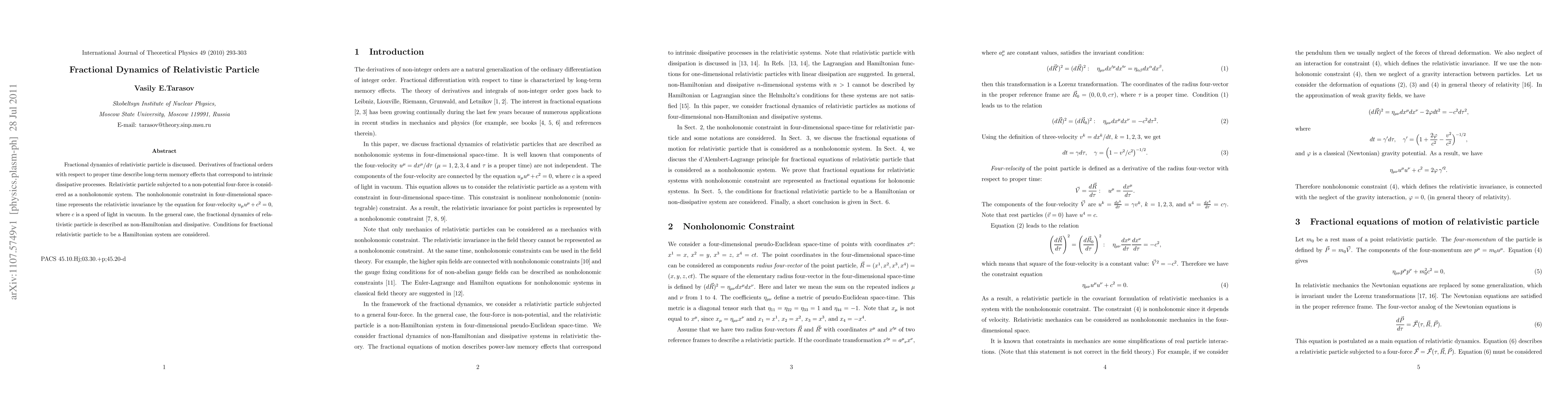 Fractional dynamics of relativistic particle is discussed. Derivatives of fractional orders with respect to proper time describe long-term memory effects that correspond to intrinsic dissipative processes. Relativistic particle subjected to a non-potential four-force is considered as a nonholonomic system. The nonholonomic constraint in four-dimensional space-time represents the relativistic invariance by the equation for four-velocity u_{\mu} u^{\mu}+c^2=0, where c is a speed of light in vacuum. In the general case, the fractional dynamics of relativistic particle is described as non-Hamiltonian and dissipative. Conditions for fractional relativistic particle to be a Hamiltonian system are considered.
