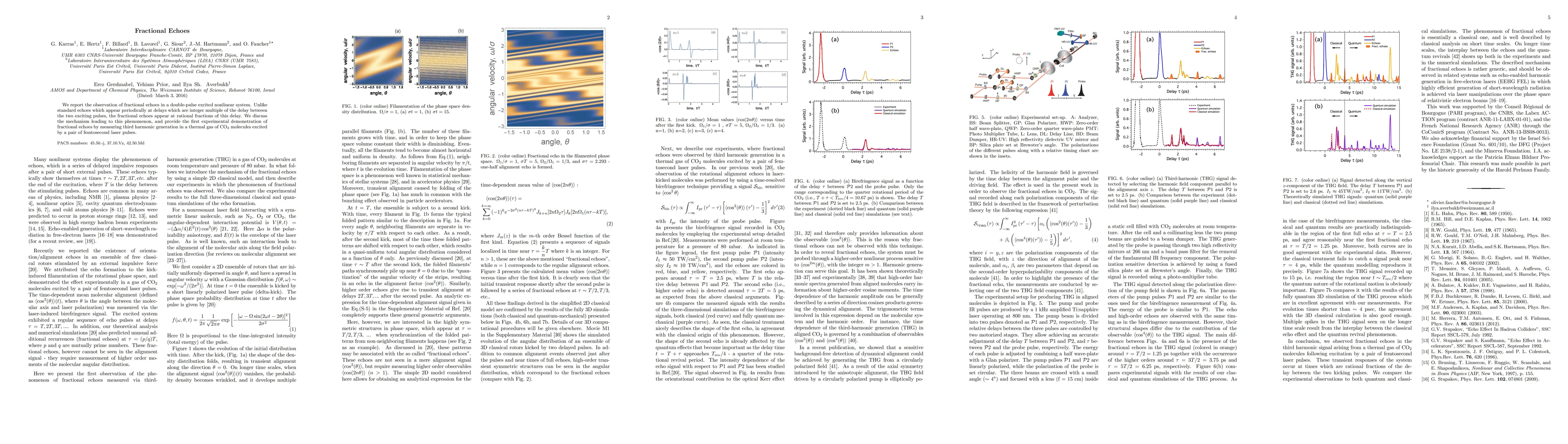 We report the observation of fractional echoes in a double-pulse excited nonlinear system. Unlike standard echoes which appear periodically at delays which are integer multiple of the delay between the two exciting pulses, the fractional echoes appear at rational fractions of this delay. We discuss the mechanism leading to this phenomenon, and provide the first experimental demonstration of fractional echoes by measuring third harmonic generation in a thermal gas of CO2 molecules excited by a pair of femtosecond laser pulses.