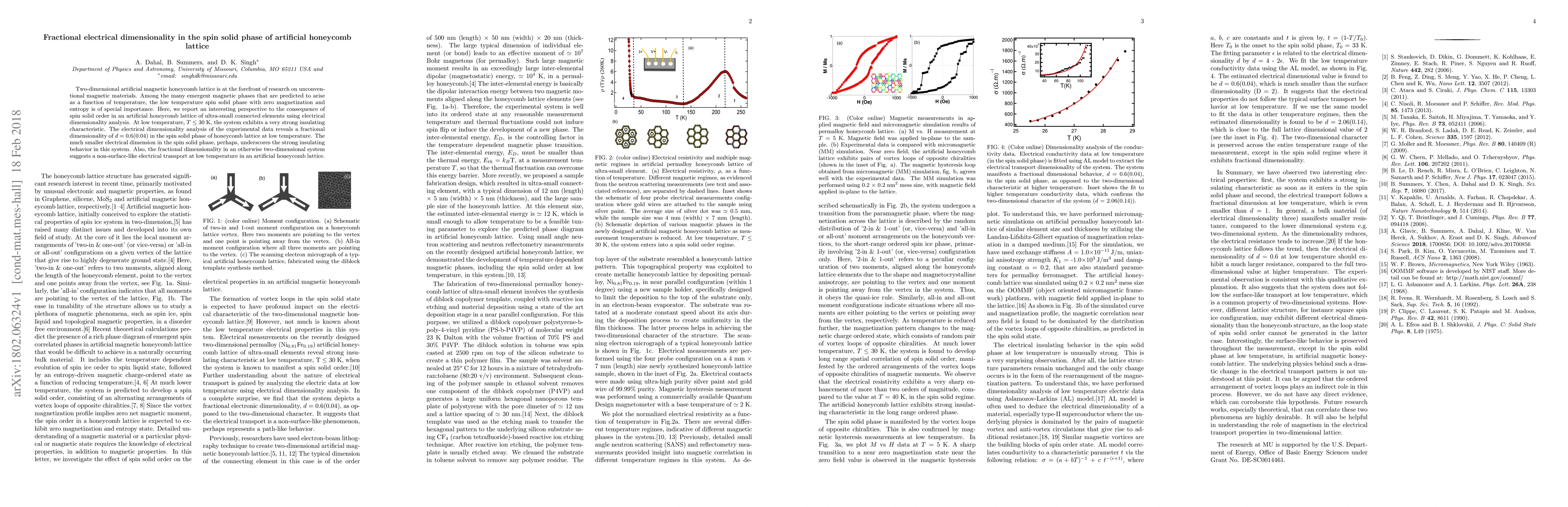 This paper investigates the spin solid phase in an artificial honeycomb lattice, revealing a fractional electrical dimensionality of $d$ = 0.6(0.04) at low temperatures, indicating non-surface-like electrical transport and strong insulating characteristics.