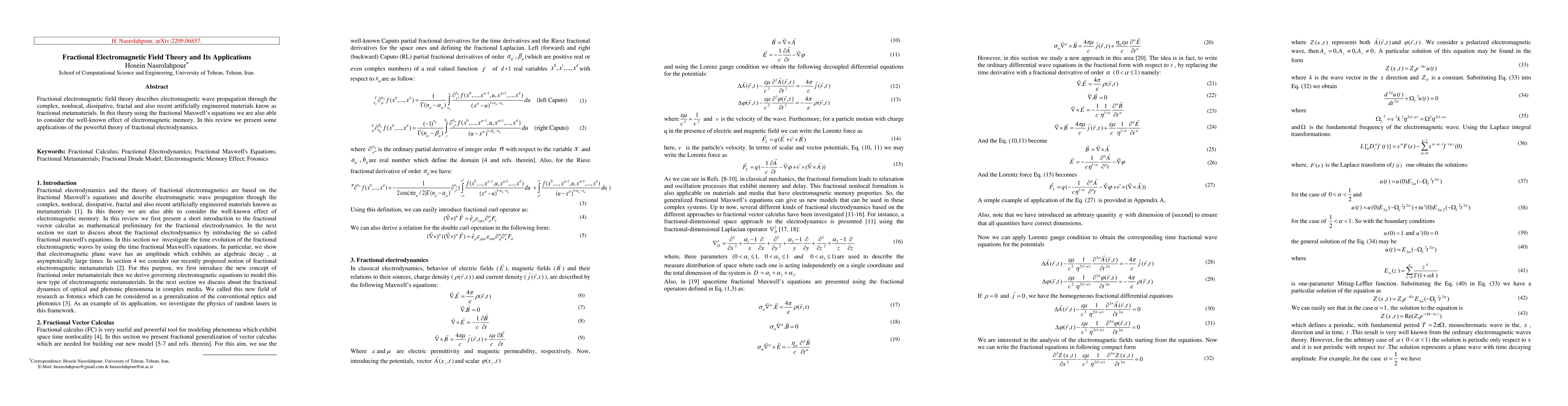 Summary: This paper explores fractional electromagnetic field theory, which uses fractional Maxwell equations to describe wave propagation in complex materials like fractional metamaterials, and highlights its applications in advanced electromagnetic research.