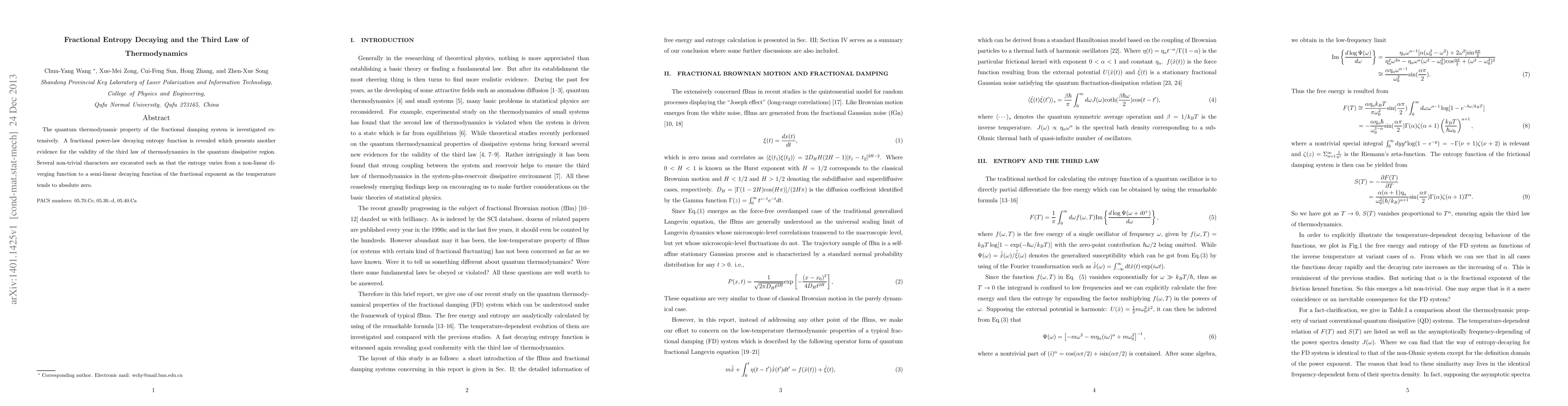 This paper investigates the fractional entropy decay in quantum thermodynamic systems, revealing a fractional power-law decaying entropy function that supports the third law of thermodynamics in quantum dissipative regions. It highlights the transition of entropy from a non-linear diverging function to a semi-linear decaying function as temperature approaches absolute zero.
