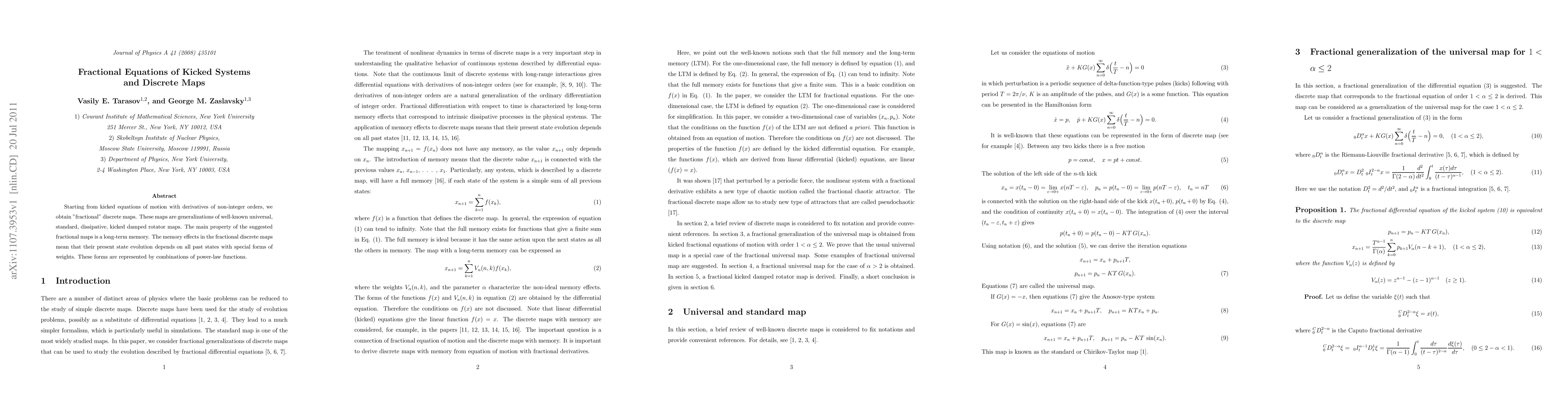 This paper explores fractional equations of motion in kicked systems, leading to generalized discrete maps with long-term memory effects. The memory in these fractional maps is characterized by the dependence on past states through weighted combinations of power-law functions.